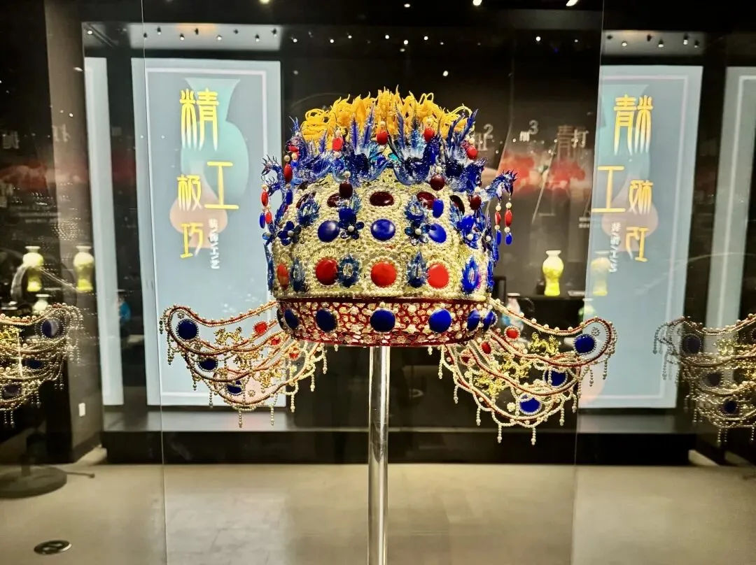 为采淄博琉璃百工之华,我们遍访淄博琉璃企业与大师工作室,广纳匠心力作:迄今器型较大的鸡油黄尊与金红柳叶瓶,体量罕见,温润与璀璨各尽其极;颜色极其难得的松石绿八方瓶,窑变似鹰,千窑一色;“凤穿牡丹”琉璃珠帘,由数千颗手工擀珠穿缀而成,流光溢彩;更集鲁派内画“四大神笔”—李克昌、文向君、孙即杰、张广庆的代表之作,方寸之间,万里山河;还有曾在国家博物馆引发打卡热潮的琉璃九龙九凤冠,以琉璃仿制明代凤冠神韵,珠翠琉璃交相辉映。每件展品,均是淄博琉璃工匠心血之所凝。