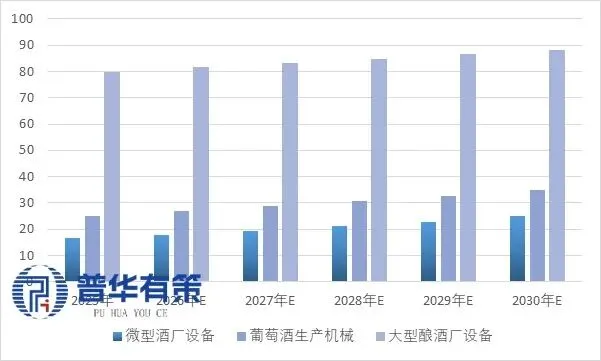 从2025年到2030年,全球酒类酿造设备三大细分市场均呈现稳步增长态势。其中,微型酒厂设备市场从16.5亿美元左右增长至24.92亿美元,年均复合增长率约8.6%,反映出精酿浪潮下中小型酿造投资的持续活跃;葡萄酒生产机械市场从25.2亿美元左右扩大至35.02亿美元,年均复合增长率约6.8%,受益于全球葡萄酒消费升级及新兴市场的需求释放;大型酿酒厂设备市场规模最大但增速相对平缓,从80亿美元左右增至88.33亿美元,年均复合增长率约2.0%,体现了成熟市场以存量更新和智能化改造为主的增长特征。整体来看,微型与葡萄酒设备领域增长动能更强,而大型设备市场则保持着稳定的基础需求。