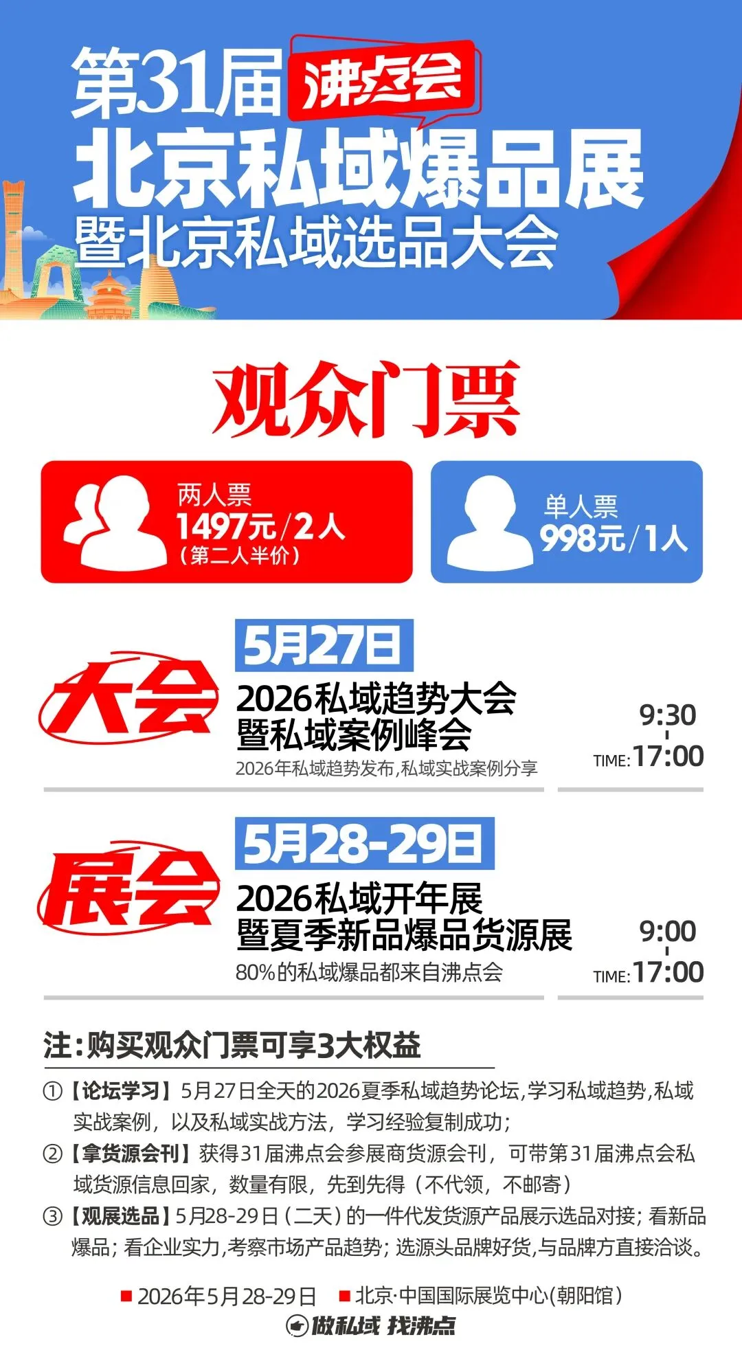 2026年5月28日-29日,第31届沸点会·全国私域团长大会暨私域新渠道爆品展览,将在北京·中国国际展览中心(朝阳馆)盛大启幕。这场以“向北方,抢市场”为核心主题的盛会,是北方私域领域的顶级盛宴,更是链接资源、拓展赛道、突破增长瓶颈的关键契机。