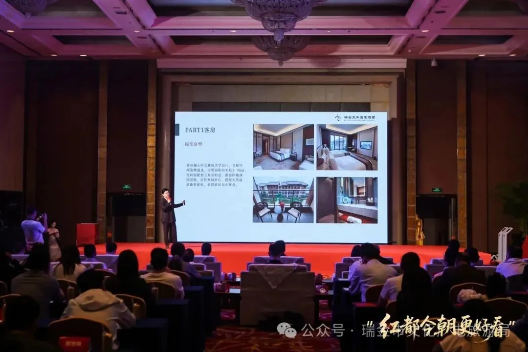 推介会现场亮点纷呈。瑞金天沐温泉度假酒店作为五钻级度假新地标,就其酒店产品与服务进行了专题推介。酒店建筑巧妙融合宋氏典雅与客家质朴,匠心打造住宿、温泉、餐饮等多元业态,以“红色研学+温泉康养”为主题,为游客打造白天追寻革命足迹、夜晚浸泡天然汤泉的全新度假体验,生动呈现红色文化与生态康养深度融合的瑞金样本。福建清新假期国际旅行社有限公司精准推介瑞金旅游精品线路,为福州市民量身定制灵活多样的赴瑞旅游优质方案:线路一为“寻根筑梦”瑞金二日游,串联叶坪、红井、二苏大、象湖里文化街区及罗汉岩等核心景区,实现红色教育与自然景观深度融合;线路二为“温泉奢享”瑞金三日游,在深度体验红井、二苏大、叶坪等革命旧址群基础上,搭配五钻天沐温泉度假酒店,形成“红色研学+生态康养”的特色行程。两条线路均融入红歌对唱、沉浸式体验等互动环节,配有完善的交通、住宿及导游服务,满足不同群体需求,全方位展现瑞金作为“共和国摇篮”的深厚历史底蕴与新时代文旅魅力。