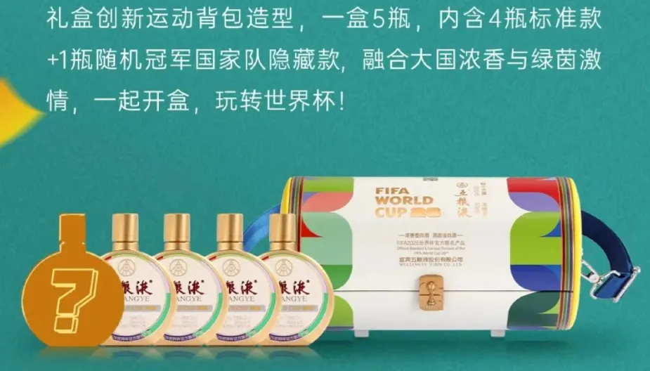 4月24日,五粮液美加墨世界杯胜利小酒礼盒上线,在山姆独家首发上架。据悉,该礼盒每一瓶均镌刻FIFA官方授权标识,以正统身份铭刻世界盛会的时代记忆。该产品融入了盲盒及运动元素。同时,4月20日起,作为FIFA美加墨世界杯官方联名白酒,五粮液重磅上线“猜世界杯冠军,赢五粮液千万奖金”主题活动——包含1000万元现金奖池、三轮接力分奖、零门槛社交互动等。