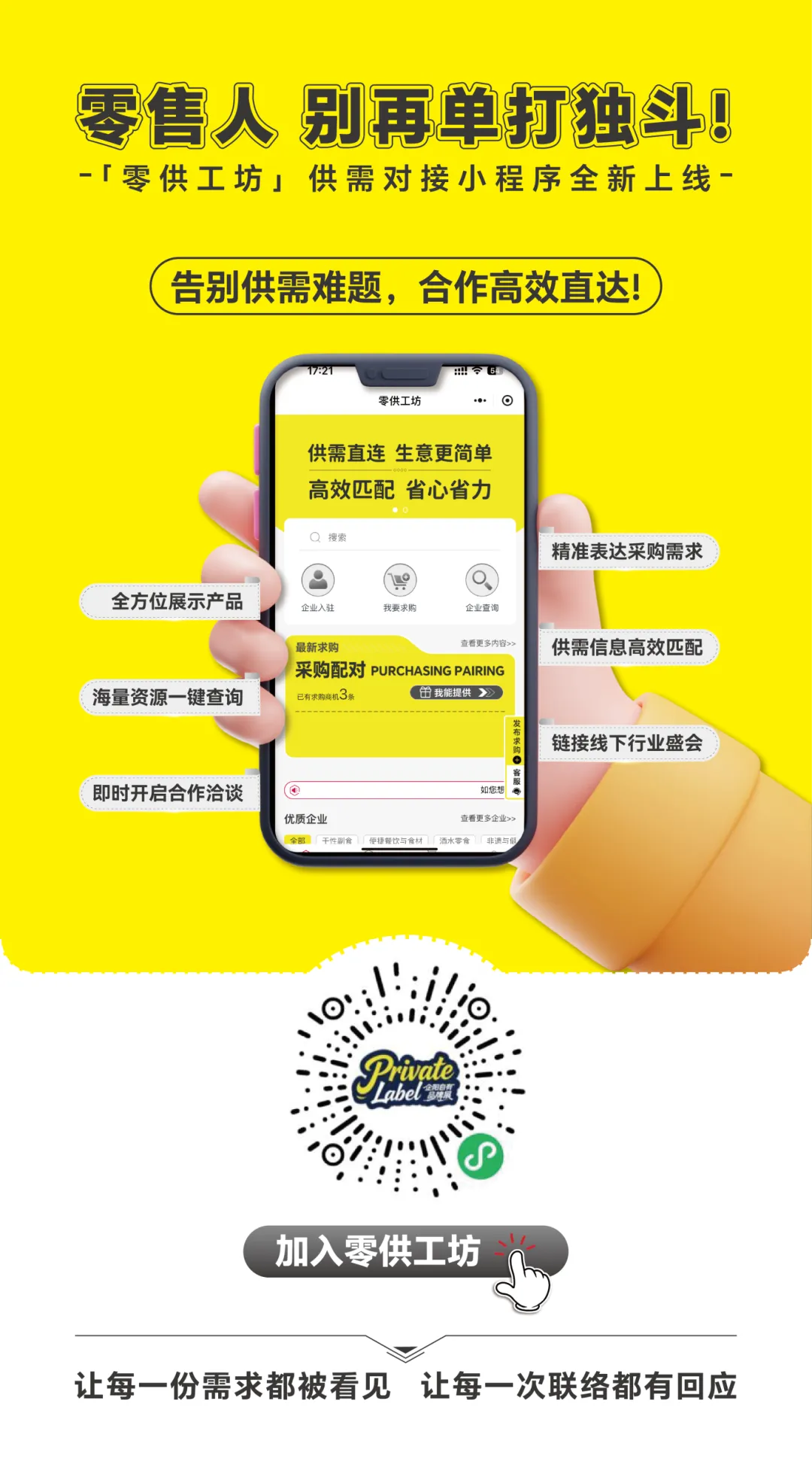 此外,欢迎您加入 “零供工坊”小程序——一场永不落幕的线上展会,提前对接供需。作为专注供需对接的服务平台,小程序集产品展示、需求发布、高效检索、精准匹配于一体,帮助供需双方快速对接优质资源,提升合作效率。采购发布、产品展示、精准搜索、企业查询、即时沟通、直通展会——六大功能,一站式解决您的供需难题。