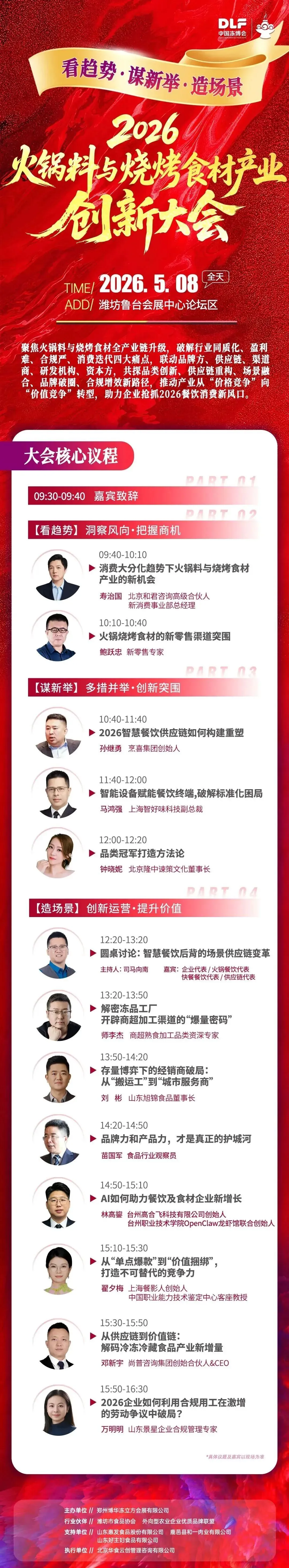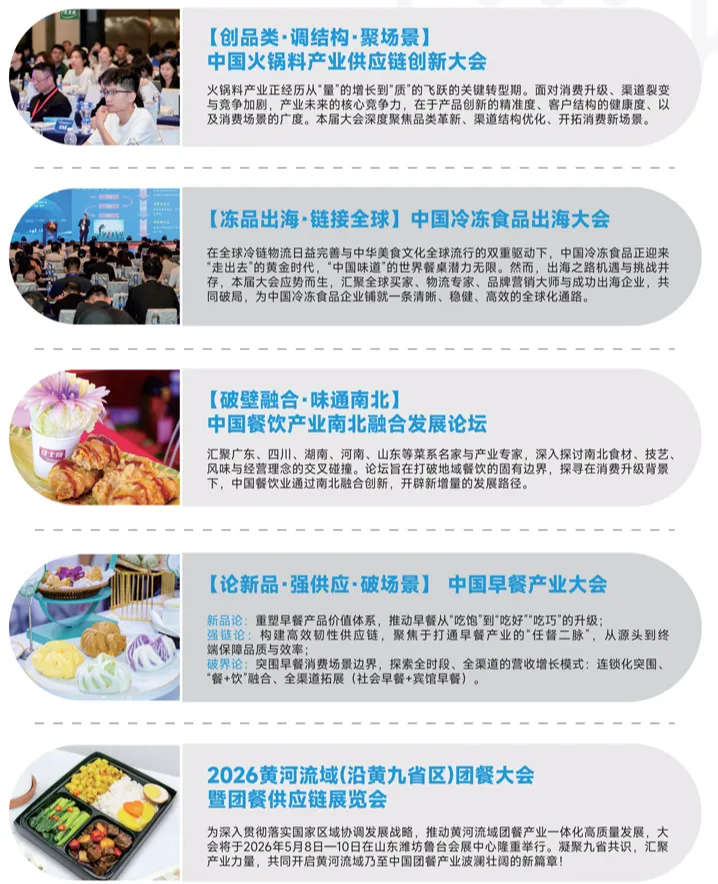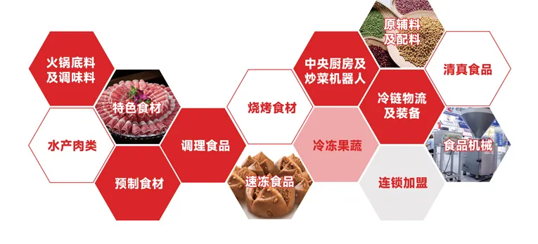 ?火锅底料及调味料、?烧烤食材、?冷链物流及装备、?水产肉类、❄️速冻食品、?连锁加盟、?特色食材、?中央厨房及炒菜机器人、?清真食品、?预制食材、?冷冻果蔬、⚙️食品机械、?调理食品、?原辅料及配料