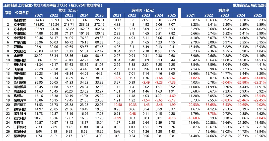 压铸行业营收利润状况