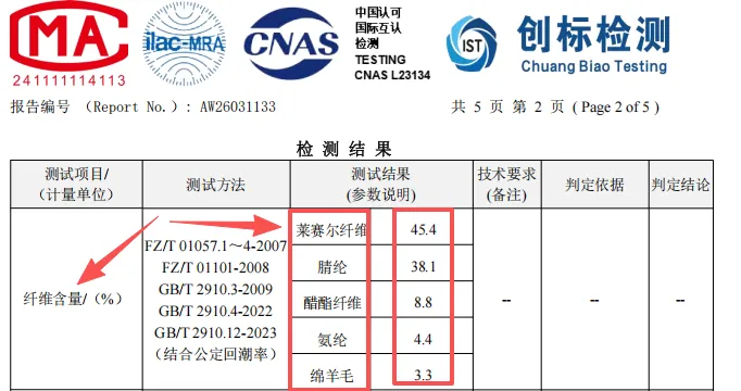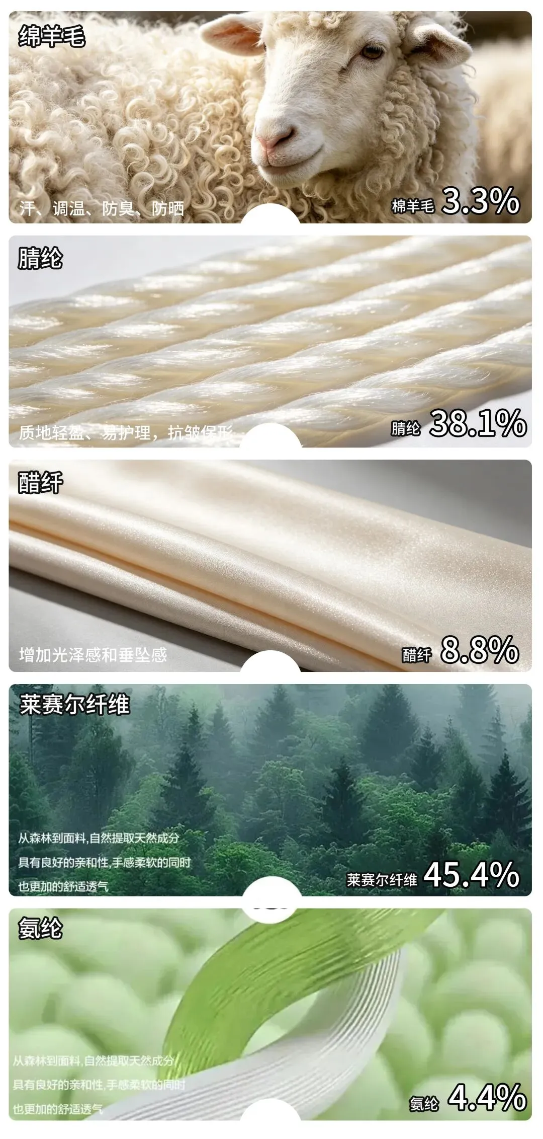(45.4%莱赛尔% 38.1%腈纶 8.8醋纤% 4.4%氨纶 3.3%棉羊毛),这比例夏天穿真的太舒服了!