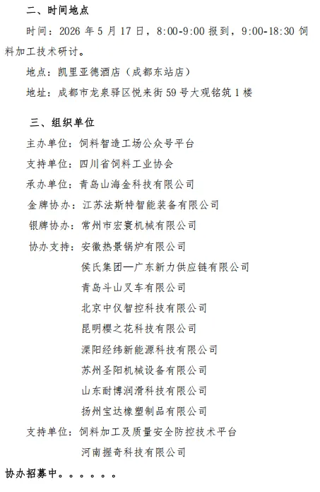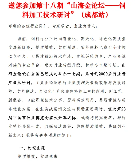 值此2026中国畜牧展览盛会召开之际,邀您参加5月17日第十八期“山海金论坛——饲料加工技术研讨”(成都站)