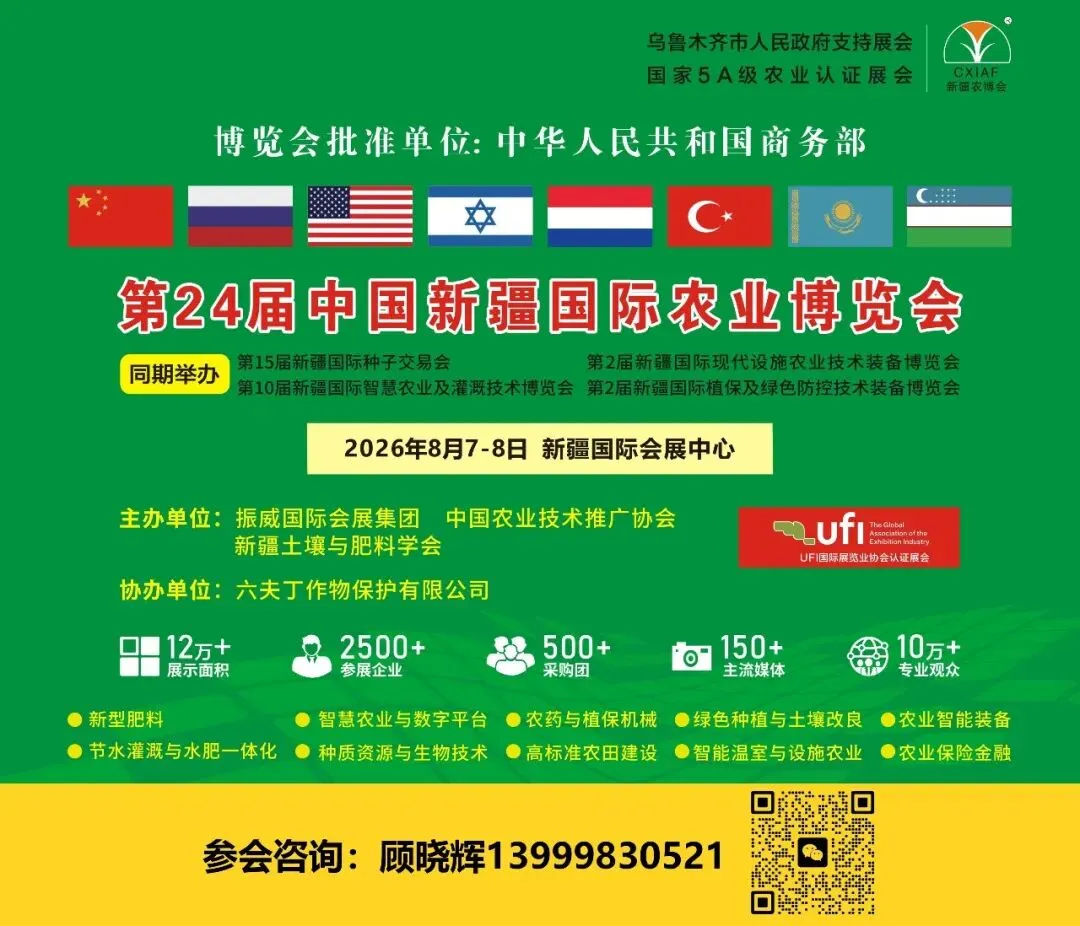 第24届中国新疆国际农业博览会(以下简称“新疆农博会”)将于2026年8月7日至8日,在新疆国际会展中心举行。本届展会展览面积12万平方米,共有来自全球100余个国家和地区的2500余家农业企业参展,专业观众预计达10万人次。