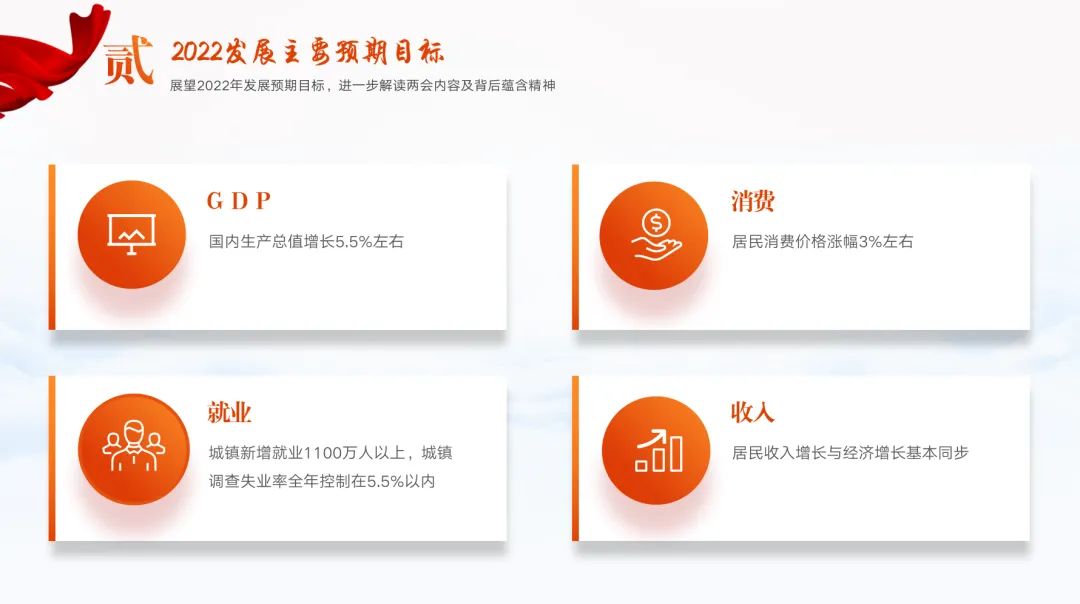 其次呈现的是政府工作报告中国家2022年发展的主要预期目标,前面是GDP、消费、就业、收入这四部分,几乎包括了社会劳动的基本全过程,后面则是在外贸、生态、粮食安全、能源问题这4个方面发力。