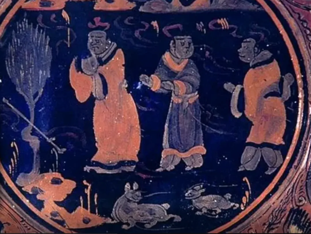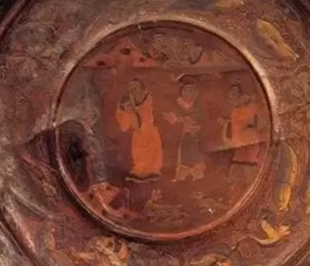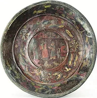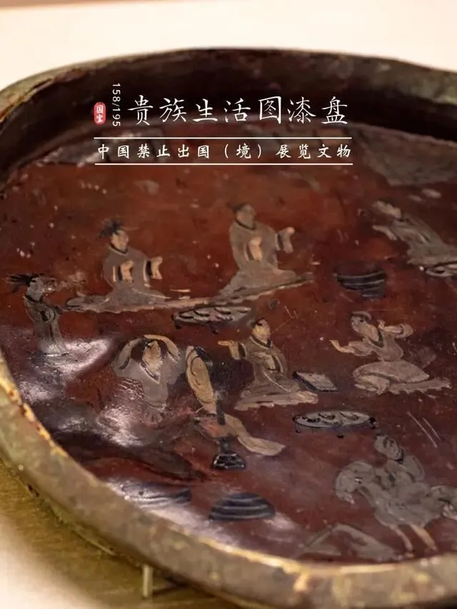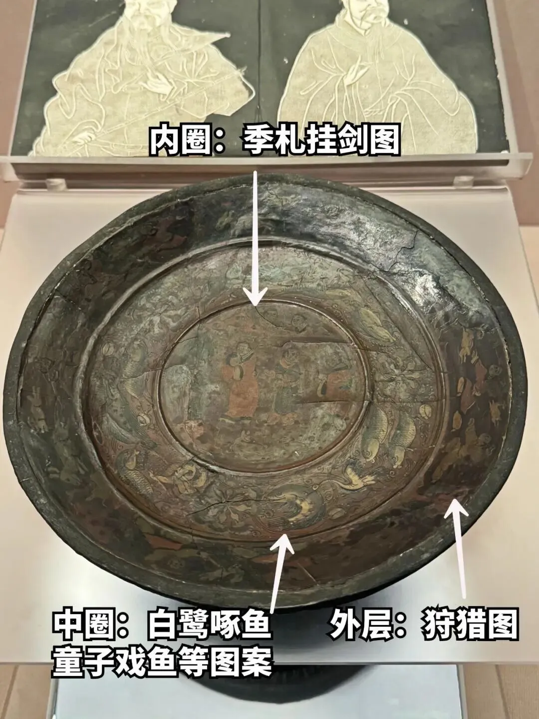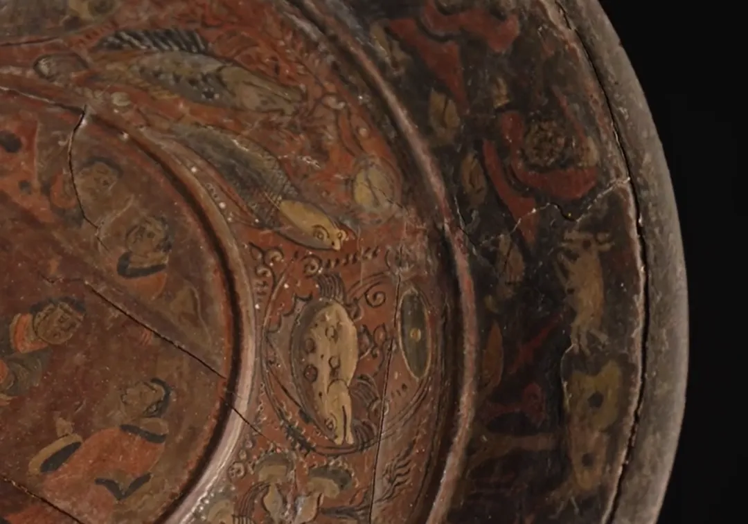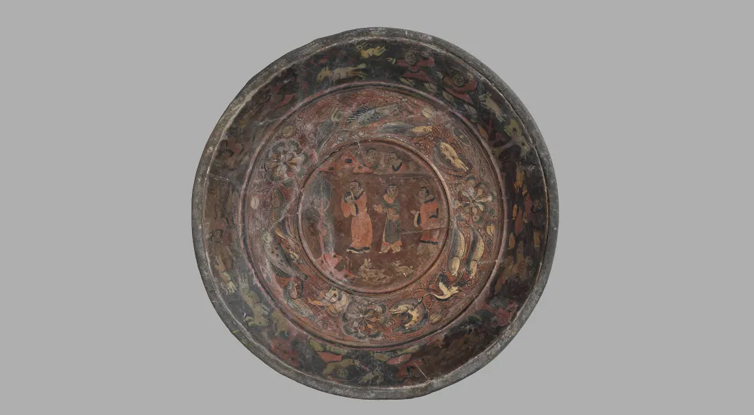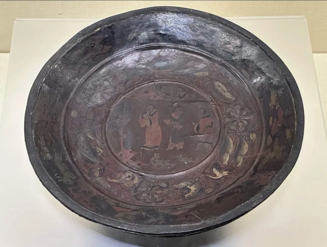 该漆盘工艺精湛,融合了汉代漆画传统与三国时期的新技法,盘底朱书“蜀郡造作牢”五字铭文,证实其产自蜀地,是吴蜀之间通过长江航运进行工艺交流的重要实证。盘面装饰分为三层:中心描绘季札在徐君墓前挂剑致祭的典故,人物神态哀婉,叙事性强;中圈饰以白鹭啄鱼、童子戏鱼与莲蓬图案,富有生活意趣;外圈为动态狩猎纹,盘背则绘红金云龙纹,象征权力与祥瑞。整件器物不仅体现了三国漆器在构图、用色与技法上的高度成熟,更因其独立的叙事性,被誉为“存世唯一有断代依据的三国绘画史料”。