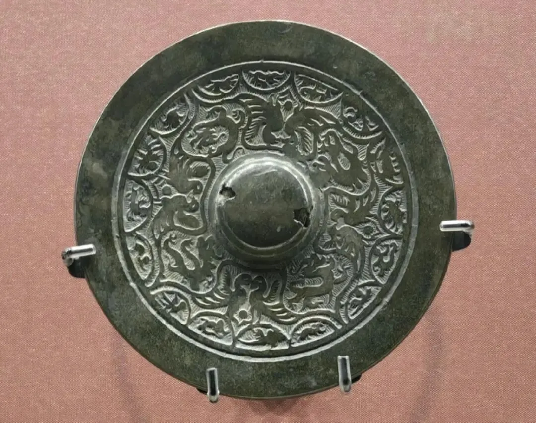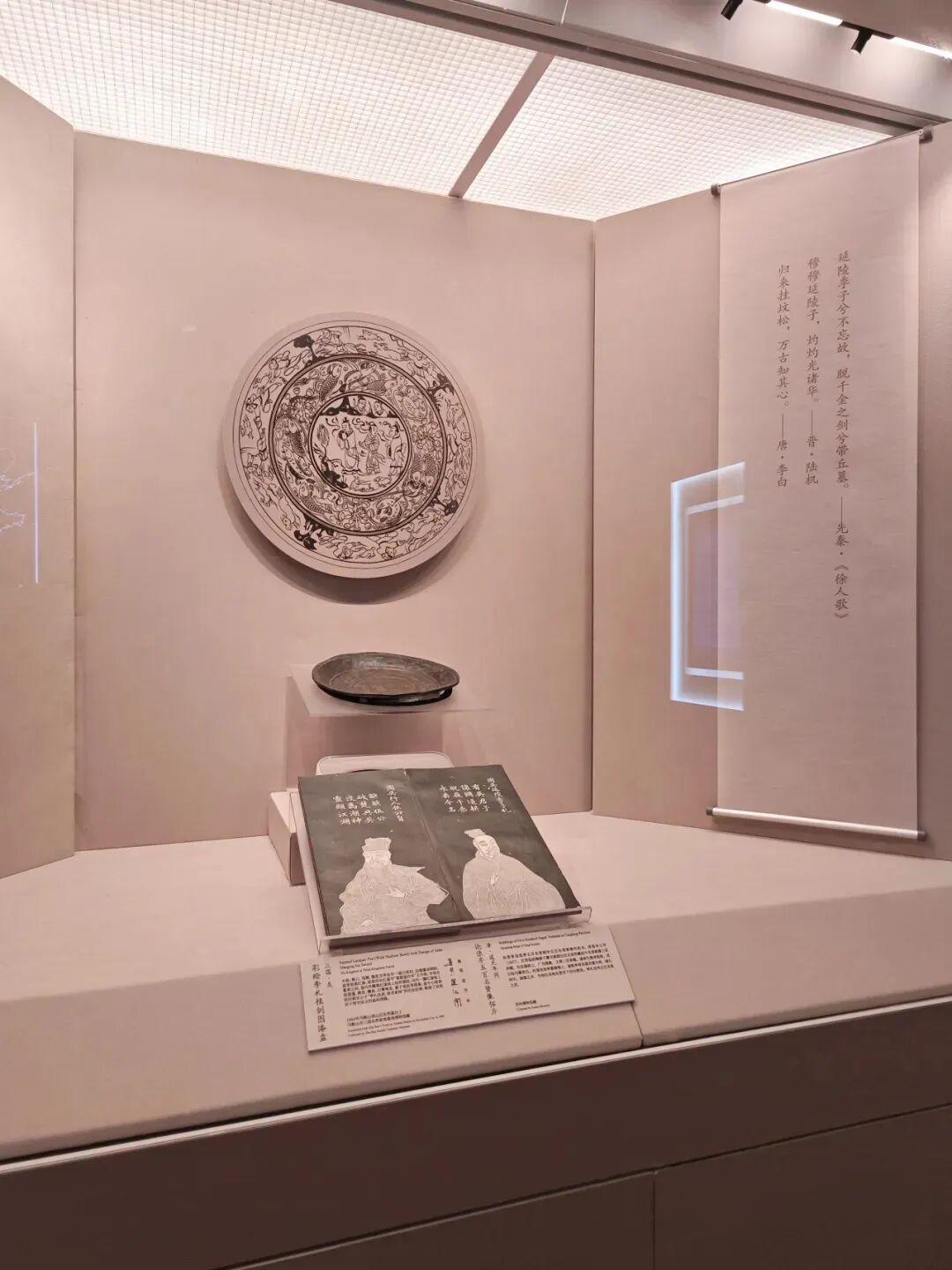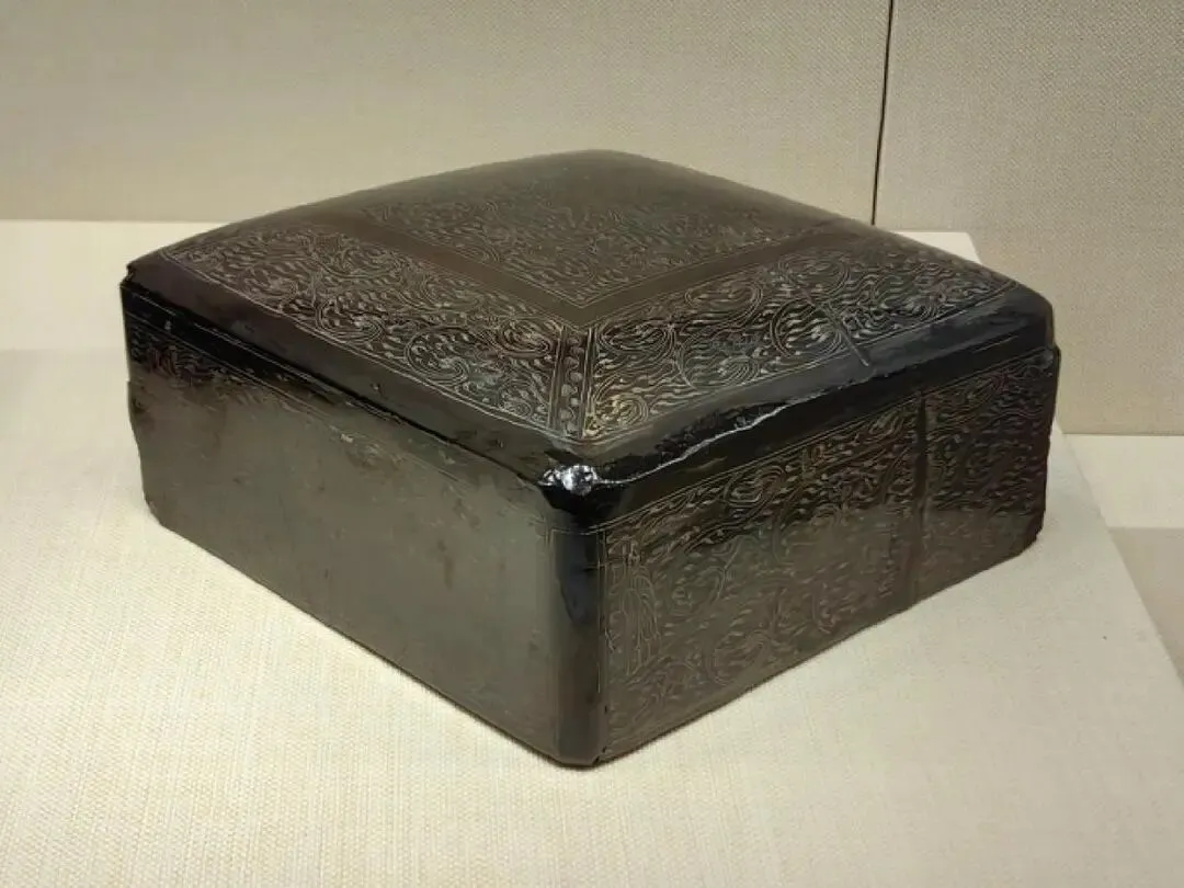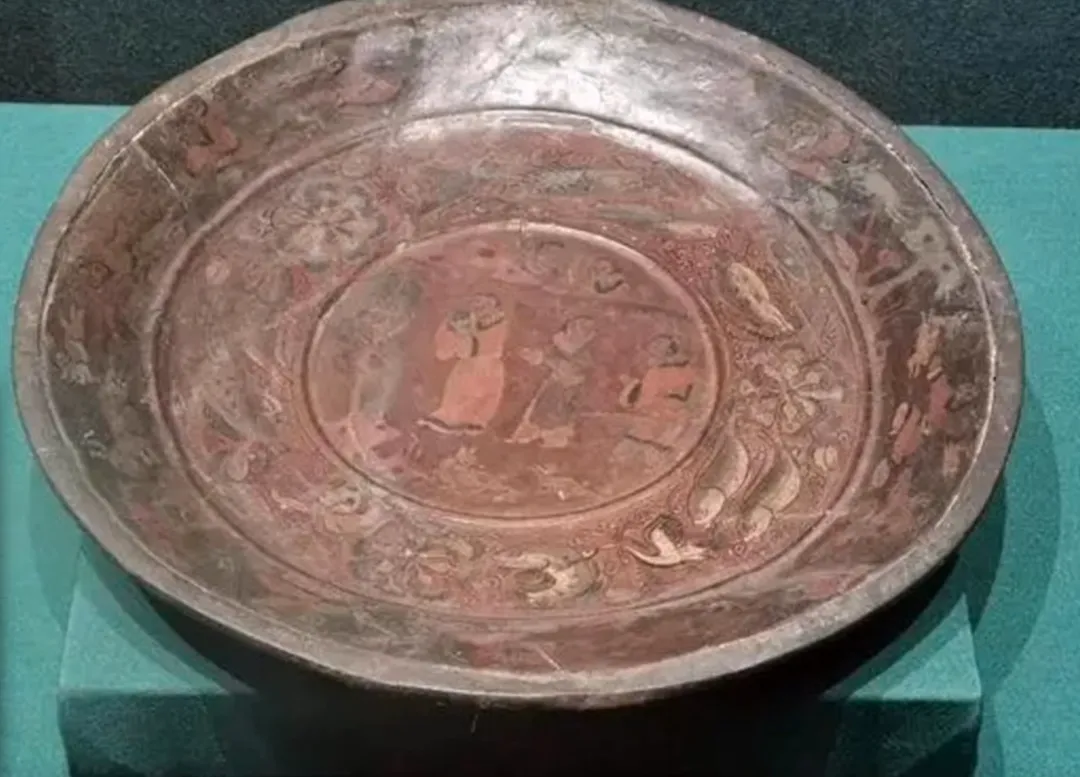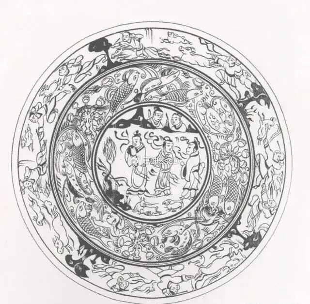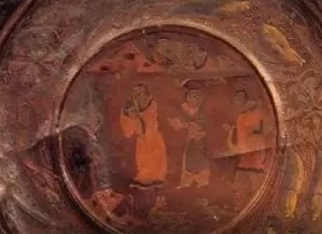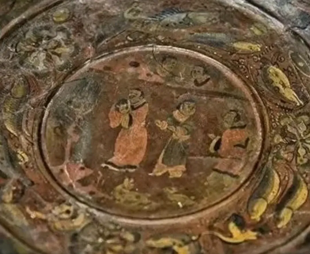 该漆盘工艺精湛,融合了汉代漆画传统与三国时期的新技法,盘底朱书“蜀郡造作牢”五字铭文,证实其产自蜀地,是吴蜀之间通过长江航运进行工艺交流的重要实证。盘面装饰分为三层:中心描绘季札在徐君墓前挂剑致祭的典故,人物神态哀婉,叙事性强;中圈饰以白鹭啄鱼、童子戏鱼与莲蓬图案,富有生活意趣;外圈为动态狩猎纹,盘背则绘红金云龙纹,象征权力与祥瑞。整件器物不仅体现了三国漆器在构图、用色与技法上的高度成熟,更因其独立的叙事性,被誉为“存世唯一有断代依据的三国绘画史料”。