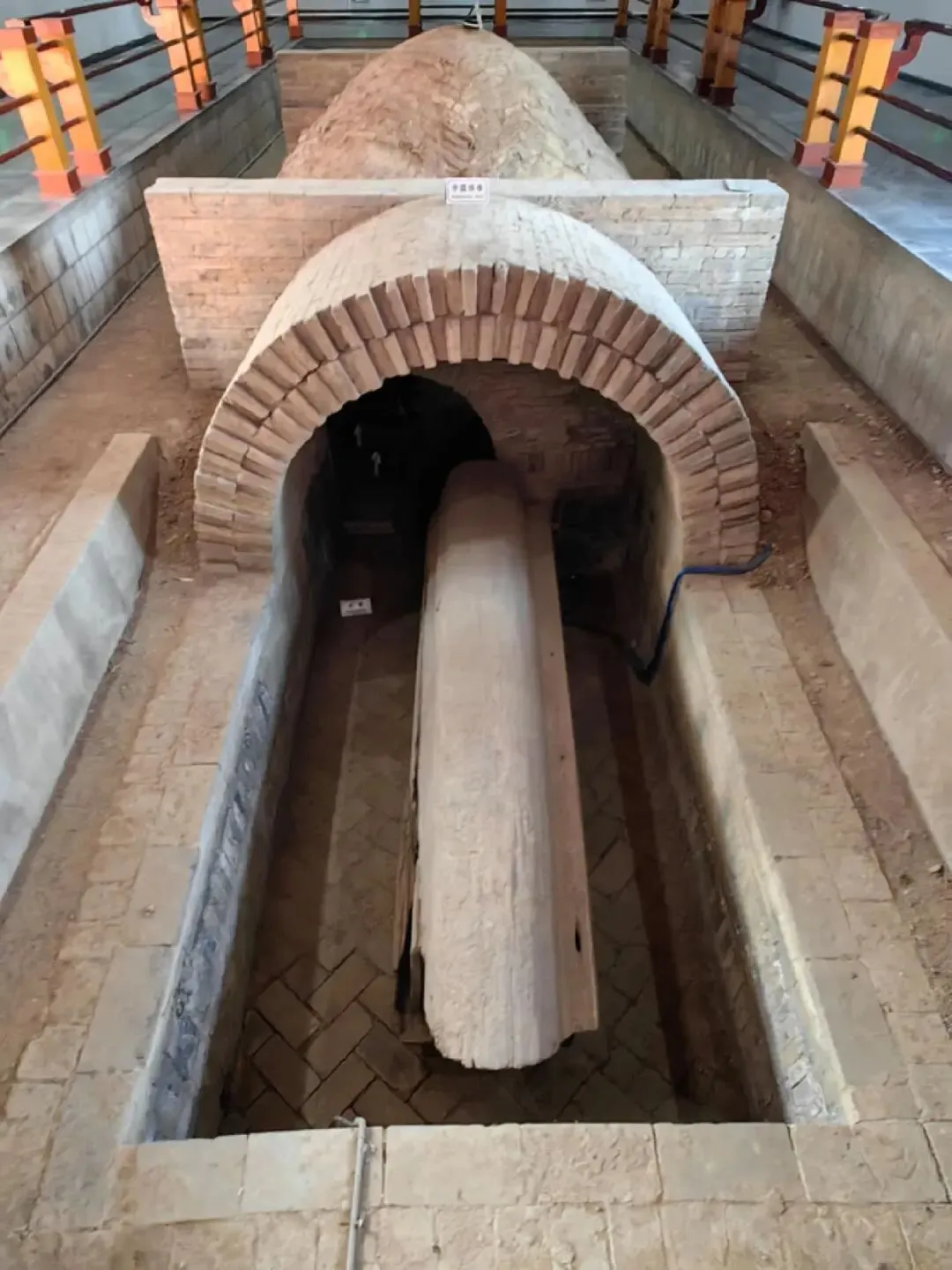 朱然墓为双室砖墓,全长8.7米,由甬道、前室、过道、后室组成,采用“四隅券进式”穹隆顶结构,是东汉至六朝时期高等级贵族墓的典型形制。墓室方向正南,墓道长9.1米,共26级台阶,坡度19度,封土堆高大,整体布局严谨,体现东吴上层墓葬的规制。墓砖上模印“富且贵,至万世”篆书吉语,彰显墓主身份尊贵,此类文字砖多见于高等级墓葬。