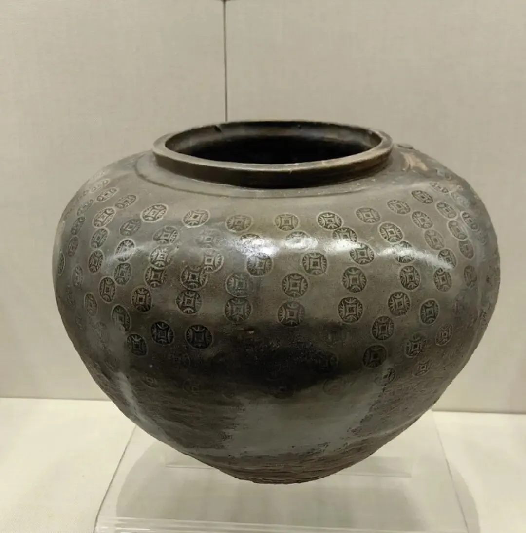 朱然墓出土的釉陶钱文罐 朱然墓出土瓷器33件,多为越窑系精品,如卣形壶、方格盒等,釉色青翠,纹饰精美。