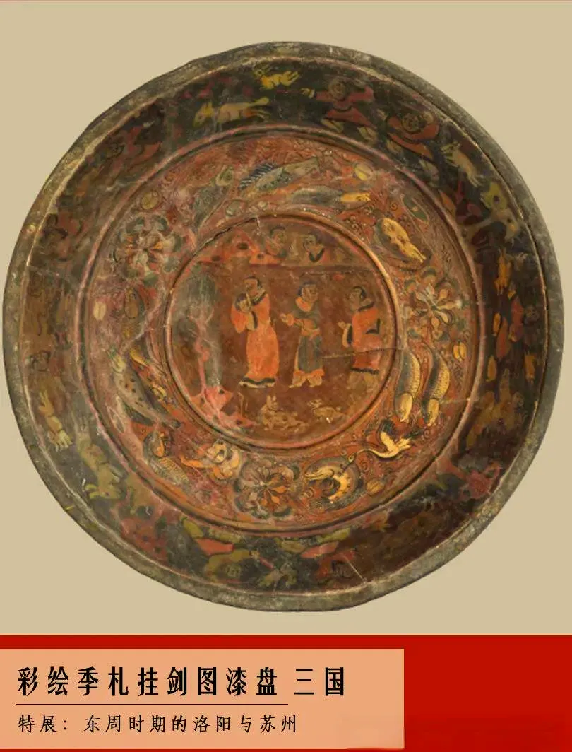 吴彩绘季札挂剑图漆盘是现存唯一有断代依据的三国时期绘画实物,该漆盘于1984年出土于安徽马鞍山市雨山的东吴名将朱然墓,墓主身份之高、出土文物之精,使其成为20世纪80年代中国考古十大发现之一。漆盘彩绘“季札挂剑”典故,生动展现季札在徐君墓前挂剑致祭的场景,彰显重诺守信的君子风范。目前,该漆盘主要收藏于安徽省文物考古研究所。