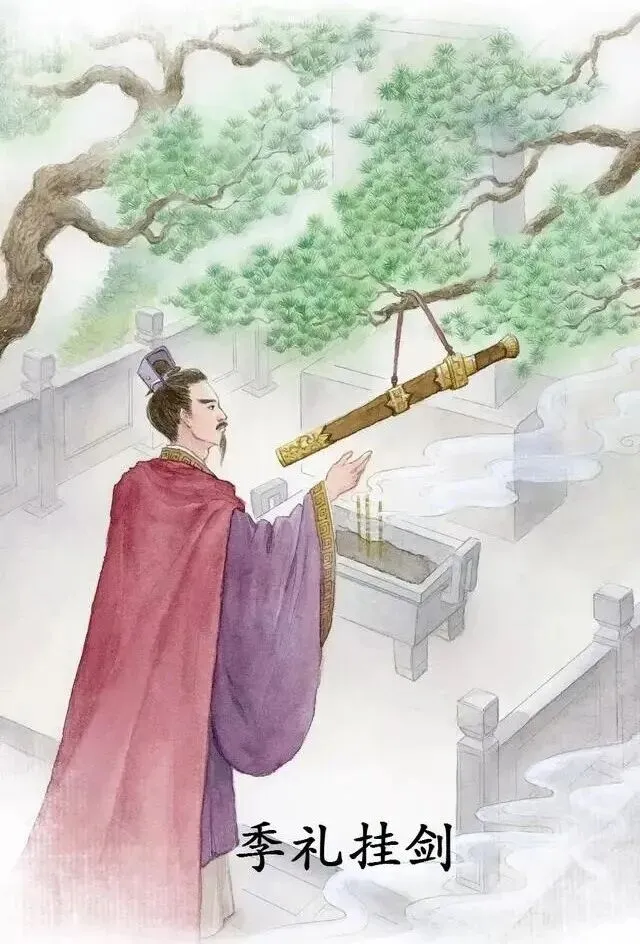 季札(吴国公子,又称延陵季子)当初出使晋国时,向北途经徐国,拜见徐国国君。徐君十分喜爱季札身上的佩剑,却碍于礼仪,没有开口索要。季札心里明白徐君的心意,但因为佩剑是使者身份的重要信物,需要带着它出使大国,所以当时没有把剑献给徐君,只是在心里默默许下了承诺。等他完成出使任务返回时,再次经过徐国,却得知徐君已经去世了。季札于是解下自己的宝剑,挂在了徐君墓前的树上,才转身离开。随行的人不解地问:“徐君已经死了,这把剑还要送给谁呢?” 季札回答说:“不是这样的。当初我在心里已经答应要把剑送给他了,怎么能因为他去世了,就违背我当初的本心呢!”