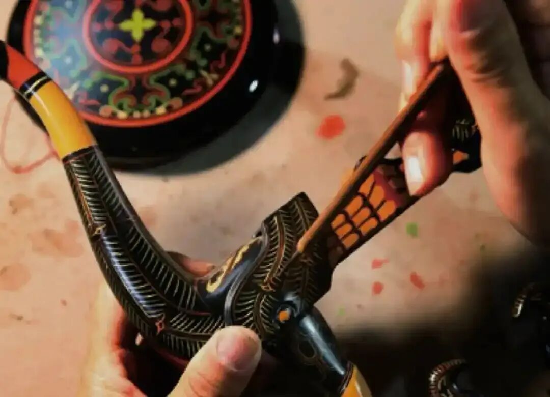 漆器制作过程:胎体处理,将木胎打磨平整,无毛刺、无裂纹,棱角轻微倒圆,避免后期崩裂;胎面薄刷一层生漆后贴上夏布,用刮板压实,无气泡、无褶皱,阴干至完全硬化;用生漆 + 粗瓦灰调成糊状整体厚刮一遍,填平布纹与凹陷,干透后 400~600 目砂纸打磨平整;用生漆 + 中瓦灰薄刮找平,干后 800~1200 目打磨;用生漆 + 细瓦灰 / 鹿角灰极薄刮,追求镜面平整度,干后 1200~2000 目水磨,手感顺滑;髹底漆(每层 2~3 天,共 2~3 层),刷透明生漆,薄、匀,阴干 → 轻磨 → 再刷,目的是封闭灰底,增强附着力;髹面漆(核心!每层 2~3 天,5~10 层),每一层都要薄刷、十字涂法,阴干后水磨,再上下一层,层数越多,漆面越肥厚温润;装饰(可选),漆加矿物颜料手绘,贴金箔、螺钿、蛋壳、戗金、雕漆、莳绘(新手先从简单彩绘开始);罩透明漆(2~3 层)保护装饰层,让光泽统一; 推光(成品关键),用细瓦灰 + 植物油,反复擦磨,最后用手掌反复推擦,出现温润宝光即完成。
