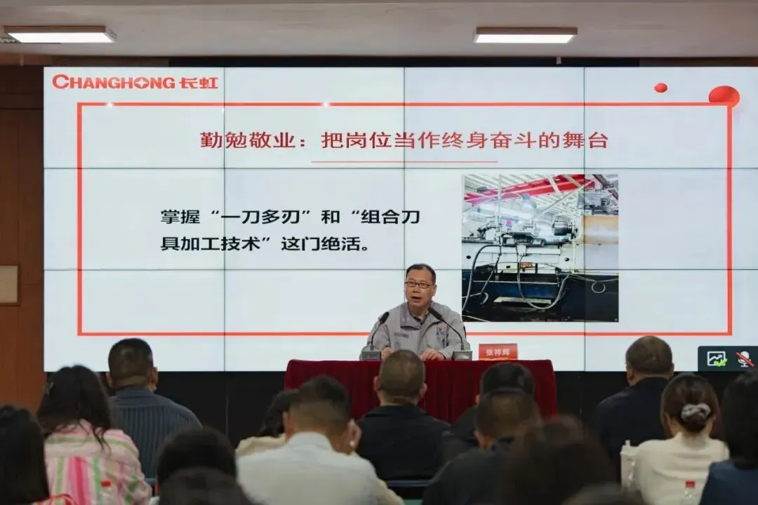 随后,在“弘扬劳模精神 凝聚奋进力量”主题党日活动上,全国劳动模范、长虹技佳制造专家张祥辉首先向大家分享了个人扎根长虹三十载的成长故事。作为一名普通长虹产业工人,张祥辉将长虹精神刻进岗位、融入日常、干出价值:他以“艰苦奋斗”立身,深耕一线炼就扎实技艺;他以“精益求精”提质,不放过每一个细节,只为追求卓越品质;他以“敢为人先”破局,大胆推动工艺革新,重塑制造工艺;他以“锲而不舍”攻坚,面对困难绝不退缩,一次次突破“卡脖子”技术难题,牢牢守住关键技术自主权。