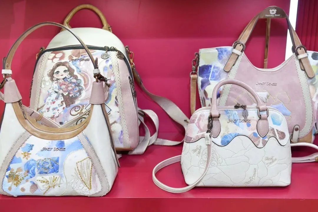 远看像彩绘,近看又有瓷片般的层次与光泽……走进广州市谷希欧皮具有限公司展位,皮具上明丽的色彩和纹样吸引了不少客商的目光。