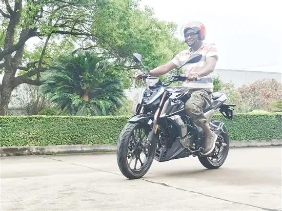 “Veryfast!Verygood!”近日,鹤山国机南联摩托车工业有限公司(以下简称“国机南联”)的试车场内引擎轰鸣,西非客商EgueAnge坐上该公司自研的新款摩托车,认真地进行样车测试,快速且稳定地完成了一系列过弯动作后,他竖起大拇指,为国机南联点赞。当天,他详细了解了该公司的全系列车型。