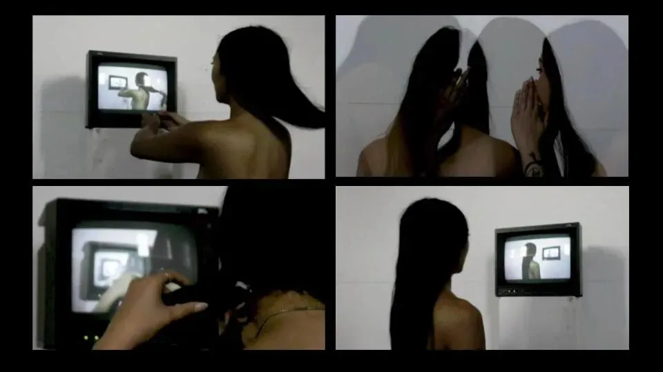 她拍自己给儿时邻居梳头的画面,投影在老式 CRT 电视机上。