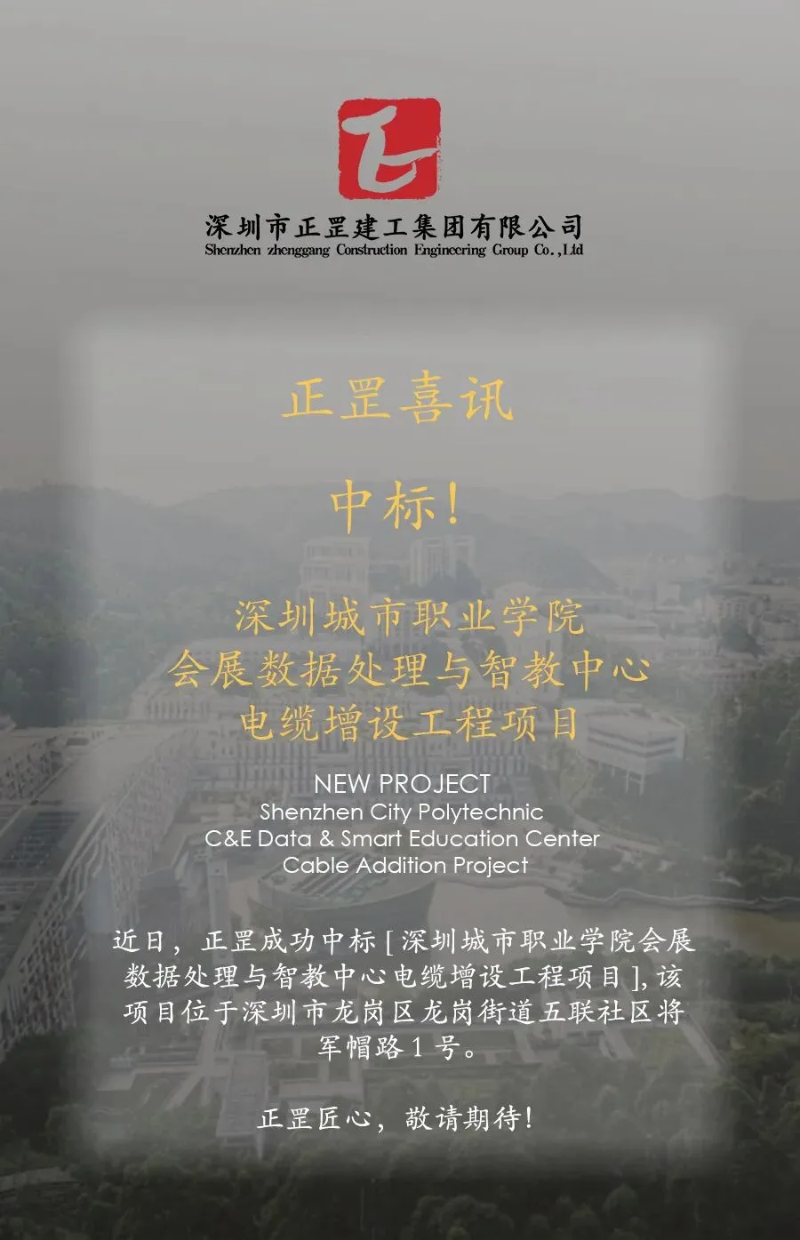【正罡集团】中标!中标深圳城市职业学院会展数据处理与智教中心电缆增设工程项目