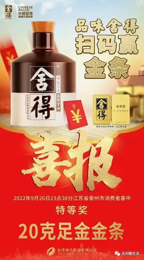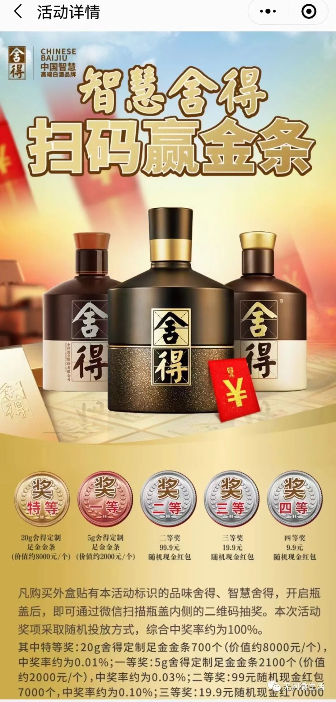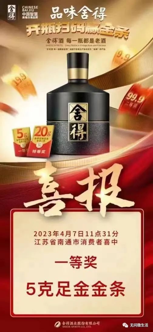 据悉:舍得酒业在长期开展的扫码赢金条活动中,智慧舍得、品味舍得特等奖和一等奖分别为20g舍得定制金条一块和5g舍得定制金条一块,舍之道天道、地道特等奖为20g舍得定制金条一块。舍得酒,每一瓶都是老酒。买舍得酒,喝舍得酒均有机会免费获得品牌金条。