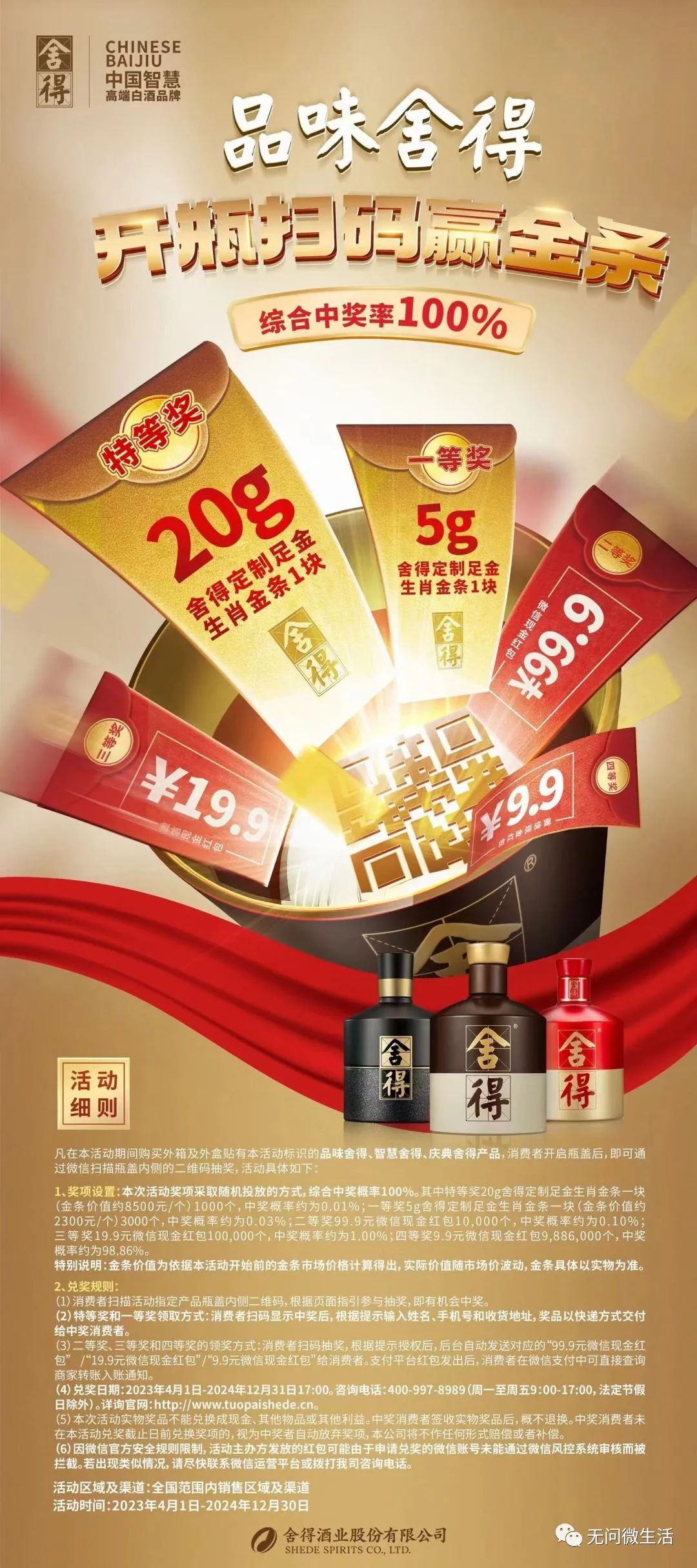 品牌金条免费送,舍得酒业开启“金”喜祝福季,4月16日至7月31日,购买一品酱香尚书坊6箱,赠送尚书坊品牌定制5g金条一枚,限量供应600枚金条,送完即止。
