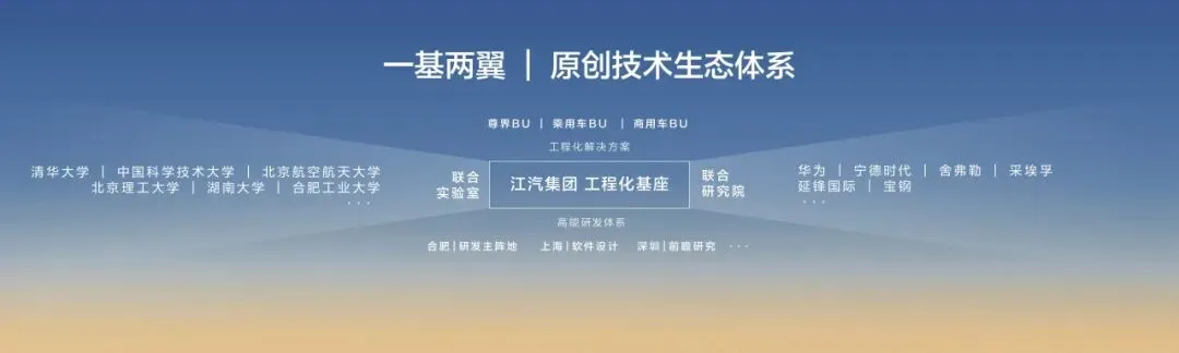 车展期间,江汽集团与清华大学签署联合创新合作协议,围绕前沿技术研究、人才培养、成果转化深化合作。这与其"一基两翼"开放式原创技术生态体系形成呼应:以江汽自身为工程化基座,一翼联动近20个顶尖院士团队及清华等高校科研院所聚焦原创技术策源,另一翼联合华为、宁德时代、舍弗勒、采埃孚等10余家头部供应链伙伴共建联合研究院,推进首发技术工程化落地。