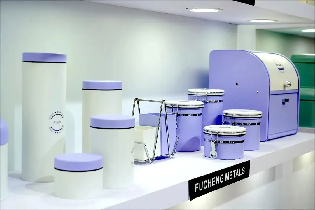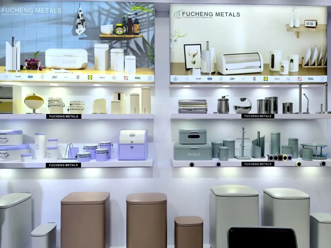 本届广交会上,富成金属携垃圾桶、面包箱、储物罐等60多个产品参展,其中10多个新品首次亮相,凭借创新设计和环保特色收获广泛关注。