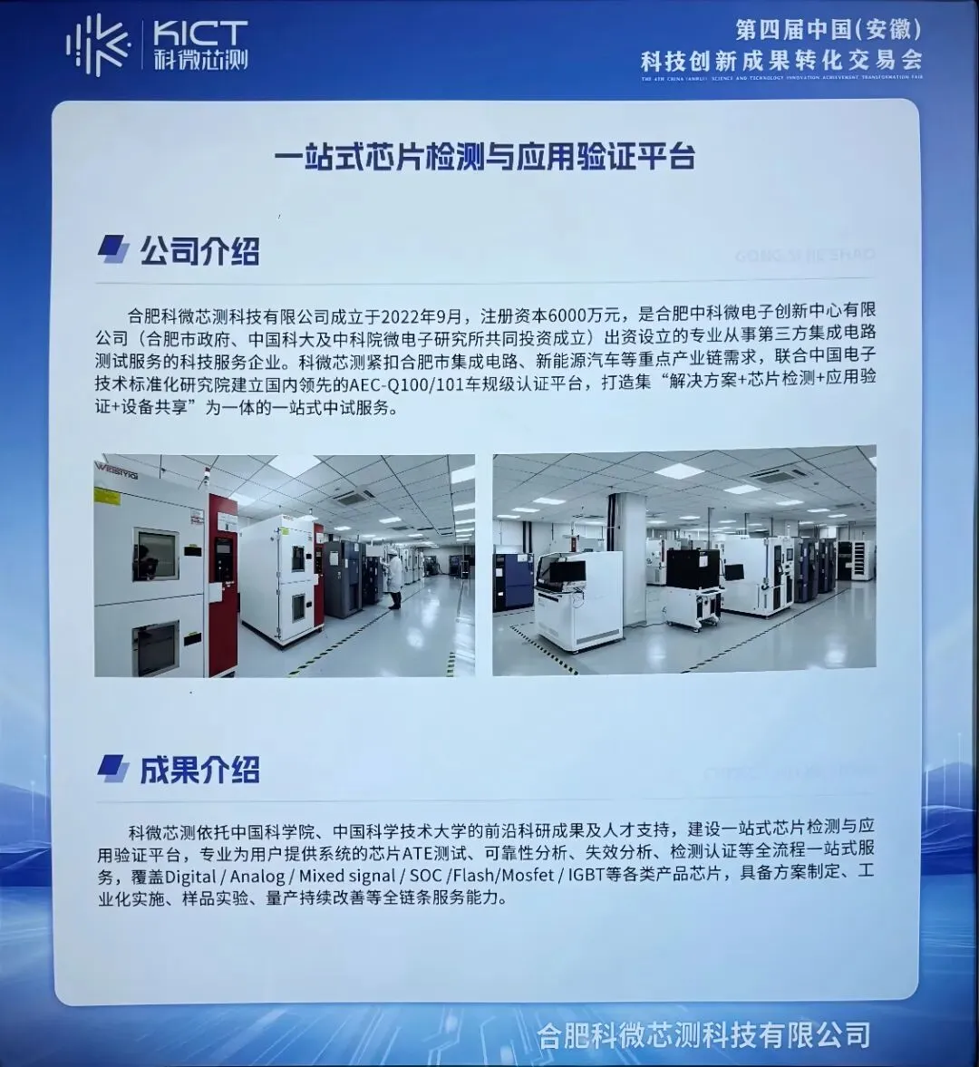 4月26日,第四届中国(安徽)科技创新成果转化交易会在合肥隆重开幕。大会以“科技打头阵 创新赢未来”为主题,由安徽省人民政府主办、上海市担任主宾省,是服务长三角一体化、推动科技成果转化落地、赋能实体经济高质量发展的国家级重要科创平台。合肥科微芯测科技有限公司荣幸受邀参展,入驻智能网联新能源汽车功能区,以专业芯片测试能力助力产业创新升级,彰显本土科创企业担当。