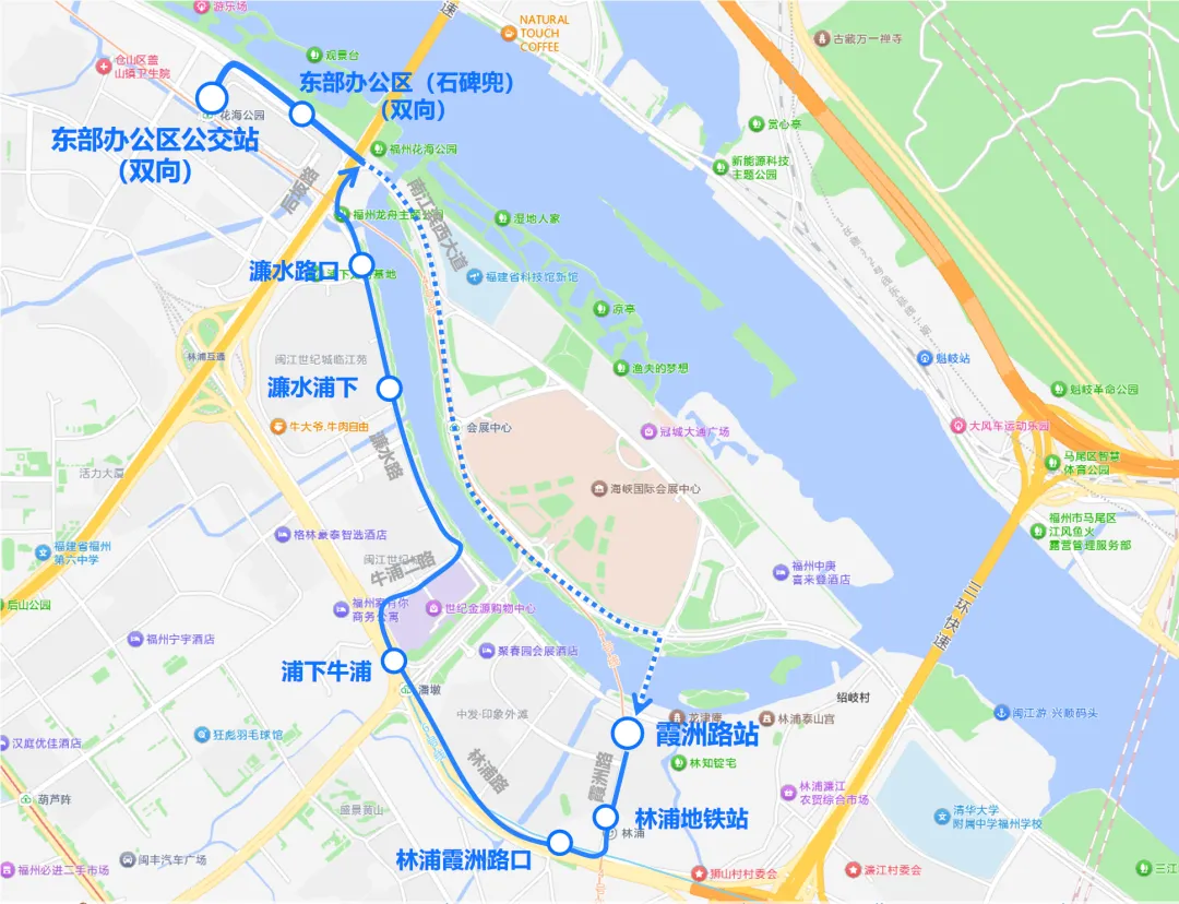 返程由南江滨西大道、霞洲路行驶至霞洲路公交站,返程仅停靠东部办公区(石碑兜)南侧站台,沿途其余站点不停靠。