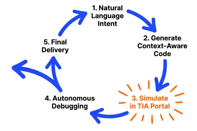 闭环验证 这里非常重要,是针对 AI 幻觉 的重要确定性保护,它在 TIA Portal 内部的仿真环境下运行代码,确认逻辑正确后才会交付出来。