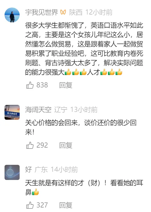 今天在人民日报视频号上看到,广交会期间国外客户打电话来压价格,12岁的女孩CiCi全程用英文和客户交谈。国外客户表示货物价格太贵,Cici首先询问客户哪部分费用太贵,是商品价格还是运费。同时,又进一步向客户解释了,他们的运费是包含所有费用,从发货到收货全流程。当客户还想压低价格的时候,小女孩坚定自信地表示,我们不降价。再次向客户解释,现在所报的价格就是综合商品质量、提供的服务、货物运送效率后最优的选择。Cici表示你可以再比比价,如果你要下单,我们可以做到立刻给您发货。这场短短2分钟的交谈,行云流水,看完让我这个大她30岁的人十分震惊,十分佩服。后来她的妈妈在直播中表示,她的女儿也没有什么英语天赋。只是在孩子小时候,可塑性最强的时候,就开始引导她学习英语。例如让孩子明白学习英语有什么用,她以后要成为什么样的人,树立远大理想等。最后,就是寻找应用的场景,去景区找外国人聊天,去跟人谈生意等。通过实践得到外国人友好的回应,帮妈妈解决生意上的问题。第二个让我感到佩服的是:小女孩逻辑思路非常清晰,有主见。我翻看了女孩妈妈发的视频,才发现其实这些都是家庭教育和引导的结果。视频里,妈妈经常会和Cici探讨复盘与国外客户交流的过程。所以说言传身教、家庭氛围实际上就塑造了孩子的品性。第三点给我触动最大的,就是小女孩透露出的成熟和自信。视频的评论区留言“感觉像是成熟的生意老板,不是小女孩”还有表示羡慕的“什么时候我儿子可以帮我跟客户沟通就好了”年纪这么小,居然懂怎么做贸易,跟家人积累了外贸经验,比教育内卷刷题强太多,能解决实际问题的能力很强大,人才”小女孩在后来的视频里说,她并没有什么天赋,只是经过这么久的学习练习,以及家里的鼓励,她没那么害怕开口说英语了而已。实力是自己一节课一节课学习,在父母的鼓励下与外国客户点点滴滴的交谈积累起来的英语口语能力水平。实力是长期跟妈妈学习谈生意的技巧,学习和了解外贸的流程规则等等。在其他小朋友孩子啊沉迷于玩游戏、看动画片的时间,Cici用在帮助家里做力所能力的事情。为她树立一个奋斗目标,为她规划一条充实且有意义的人生路线。最后,作为一个40多岁的直男,平常我很少关注社会类的新闻。但当我看到小姑娘视频的时候,真的内心被深深的触动。一方面,回想起自己小时候的生活,与Cici对比之后,不由的感叹现在的小朋友真的是如此优秀。更重要的一点,从这个现象背后,更应该看到时代、环境、家庭教育是多么的重要。对比沿海城市和西部地区,我能看到在视野、接触信息、教育理念等方面的差距。是父母引导、监督、陪伴、鼓励、坚持,与子女共同学习,共同参与所带来的结果。让我明白,在对待孩子教育上面,也要向对待工作、对待自己一样认真、细致、关爱、用心且付出时间。相关推荐:
