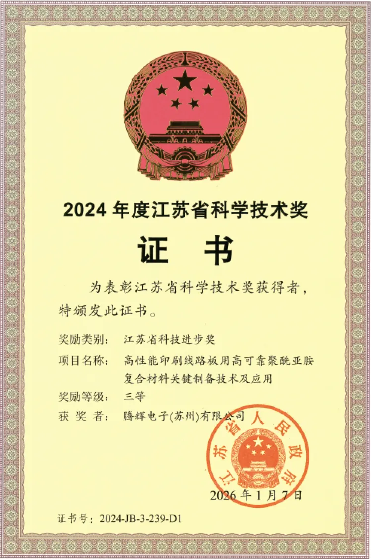 江苏省科学技术奖是江苏省科技领域的最高荣誉,也是衡量一个地区、高校或企业科技创新实力的核心标尺。日前,“2024年度江苏省科学技术奖”已揭晓,腾辉电子(苏州)有限公司与南京航空航天大学合作开发的项目——高性能印刷线路板用高可靠聚酰亚胺复合材料关键制备技术及应用,获得了江苏省科技进步奖“三等奖”。