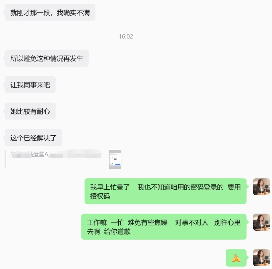 一来二去,我语气急了,说话也重了。等问题解决完,她说:“我脾气急,换我同事对接吧,她脾气好。”