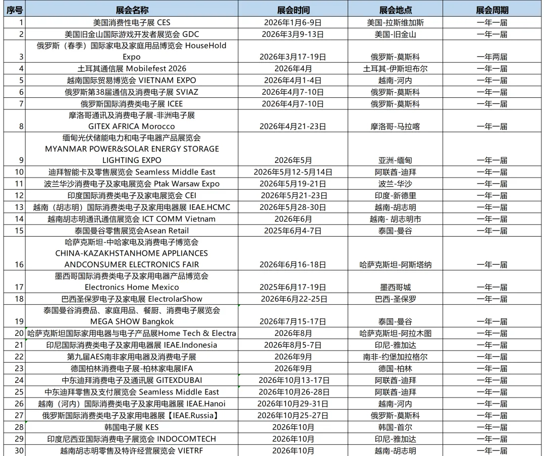 2026年全球电子消费品展会计划表