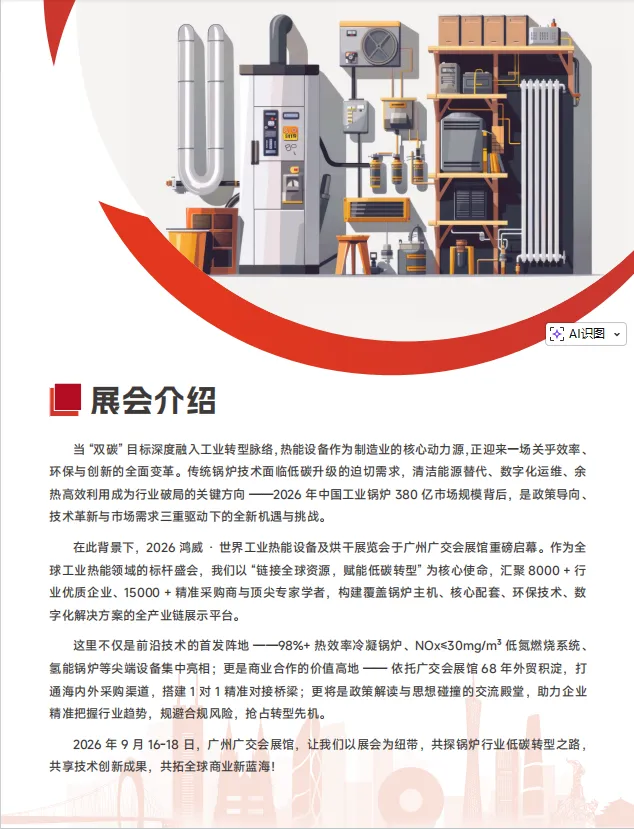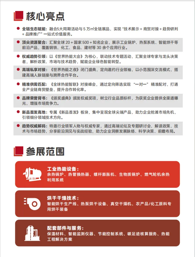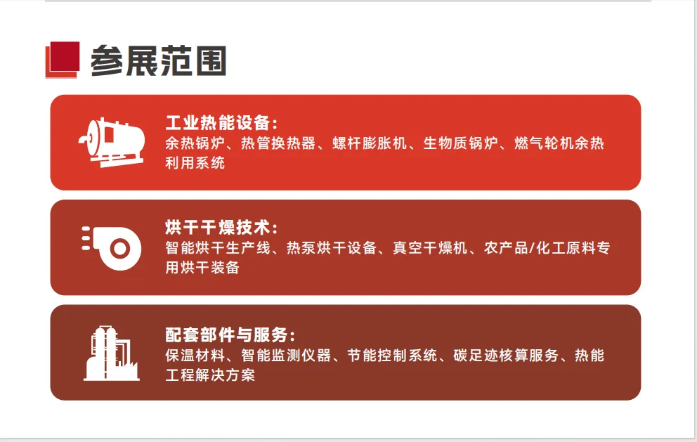 展品范围:工业热能设备:余热锅炉、热管换热器、螺杆膨胀机、生物质锅炉、燃气轮机余热利用系统