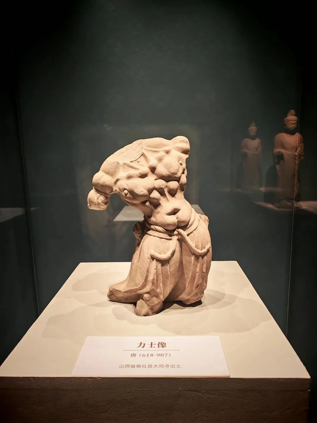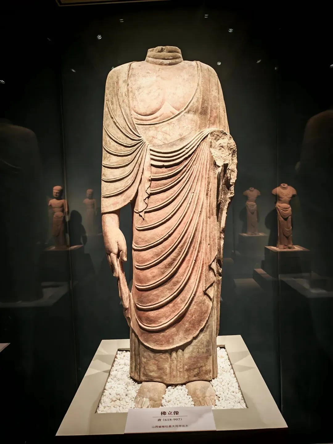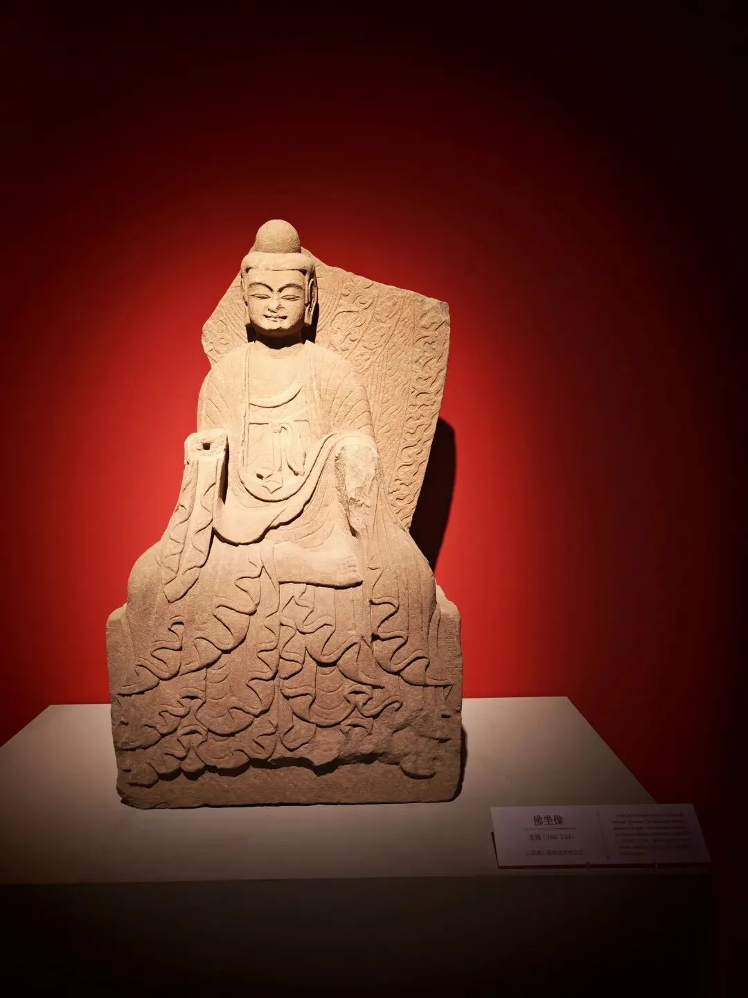 这件佛坐像来自北魏,三层头光从里到外分别是莲瓣纹、忍冬纹和化佛,背光有火焰纹,他面相端庄,高肉髻,嘴角上扬,衣纹流畅有垂感,如水波流淌又如莲花般层层绽放。