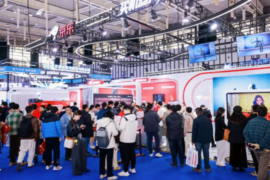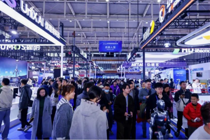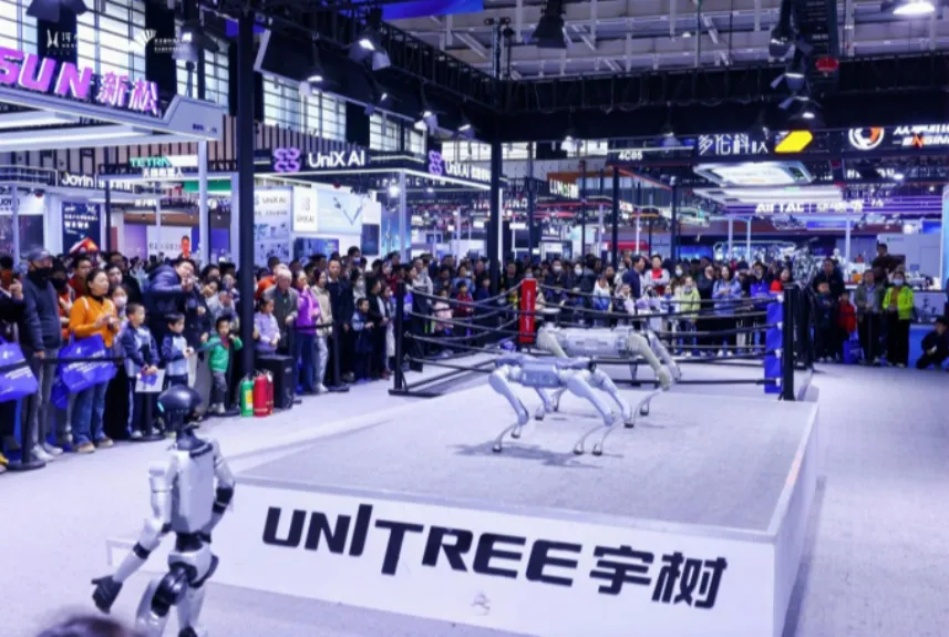 宇树科技展台前一个小型拳击台上,两个小巧灵活的机器人正激烈对战,它们出拳迅速、闪避敏捷,引得周围观众阵阵喝彩。这是本届博览会人头攒动、热闹非凡的鲜活写照。