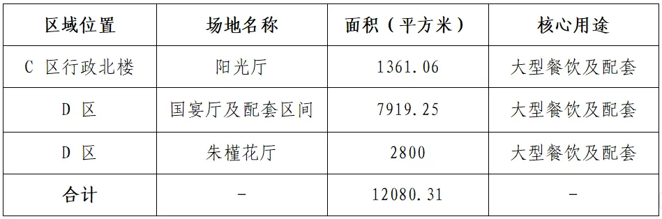 南宁国际会展中心 C 区行政北楼(阳光厅)、D 区(国宴厅、朱槿花厅)大型餐饮业态场地及配套用房整体招租(不拆分),总面积12080.31 平方米,具体如下:
