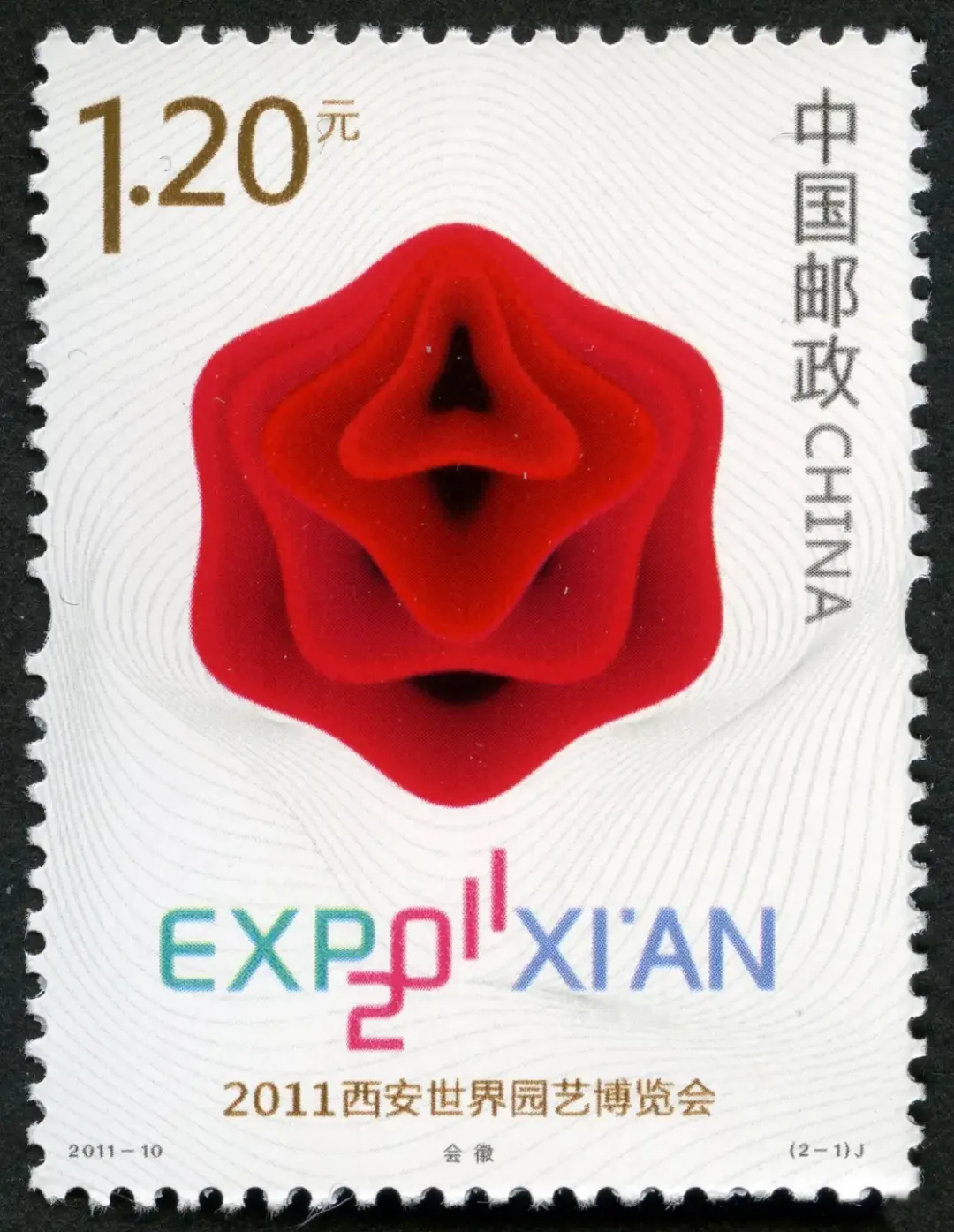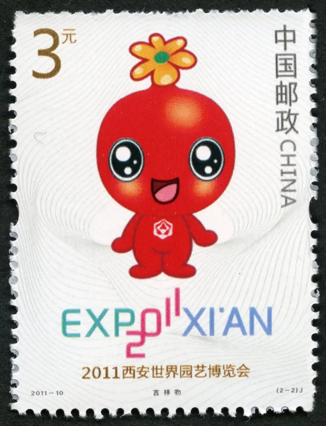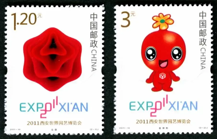 △2011—10:2011西安世界园艺博览会2011年4月28日,中国邮政发行2011—10:2011西安世界园艺博览会纪念邮票,一套2枚。2011西安世界园艺博览会,简称西安世园会,由陕西省政府、国家林业局、中国贸促会、中国花卉协会共同主办,西安市政府承办,是中国第三次举办世界园艺博览会。2011西安世界园艺博览会于2011年4月28日至10月22日在西安世博园举行,会期178天。世园会园区总面积418公顷,设置室外展园109个。会徽和吉祥物均命名为“长安花”,取意“春风得意马蹄疾,一日看尽长安花”。△(2-1)会徽会徽由陈绍华设计,是由三、四、五、六边形自然花瓣组合而成的“百花吉印”,体现了人、城市、自然、宇宙的和谐共生,寓意花开吉祥、天圆地方、林森荫育、润泽万物。△(2-2)吉祥物吉祥物形象来源于西安市花石榴花,身体的形状和色彩以石榴为创意核心,造型圆润可爱,笑容可掬,寓意本届世界园艺博览会硕果累累、圆满成功。