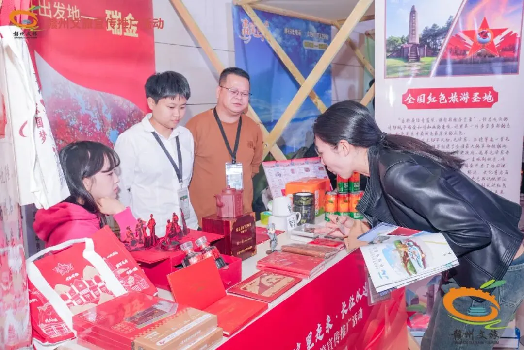 现场推介人员热情为来往游客介绍瑞金的文旅资源和红色旅游产品线路并邀请品尝瑞金的美食。