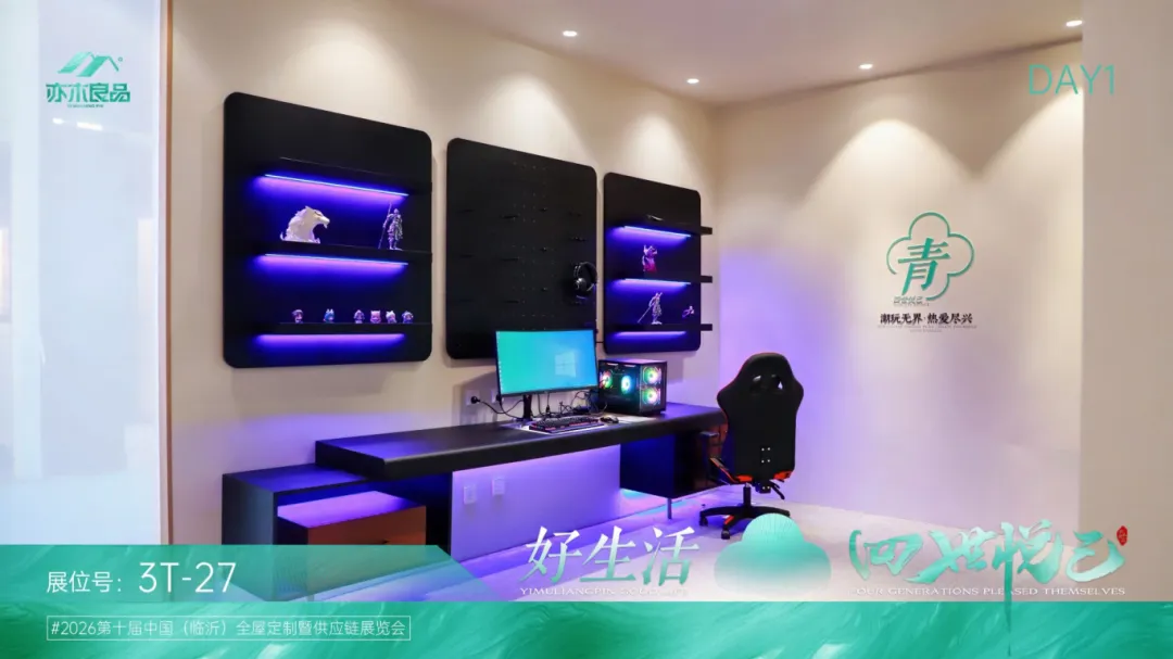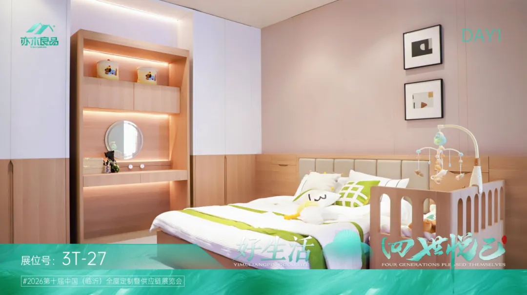 步入展馆,「开门见山」式呈现板材装饰色系列,以画框式立体展示替代传统平面展板,强化产品质感与视觉冲击。 展馆核心打造老、中、青、幼全龄实景空间,真正落地「四世悦己」理念。