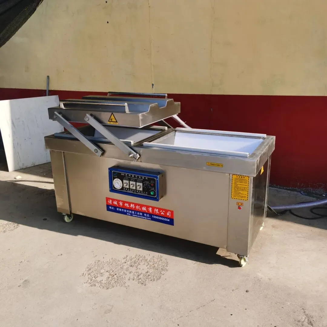 双室包装机可配合增压泵实现快速、高效抽真空。达到真空度后,热封系统自动启动,高温加热封口条完成密封,确保包装完全密闭。热封完成后,设备冷却并释放残留气体,打开真空室取出包装好的产品。