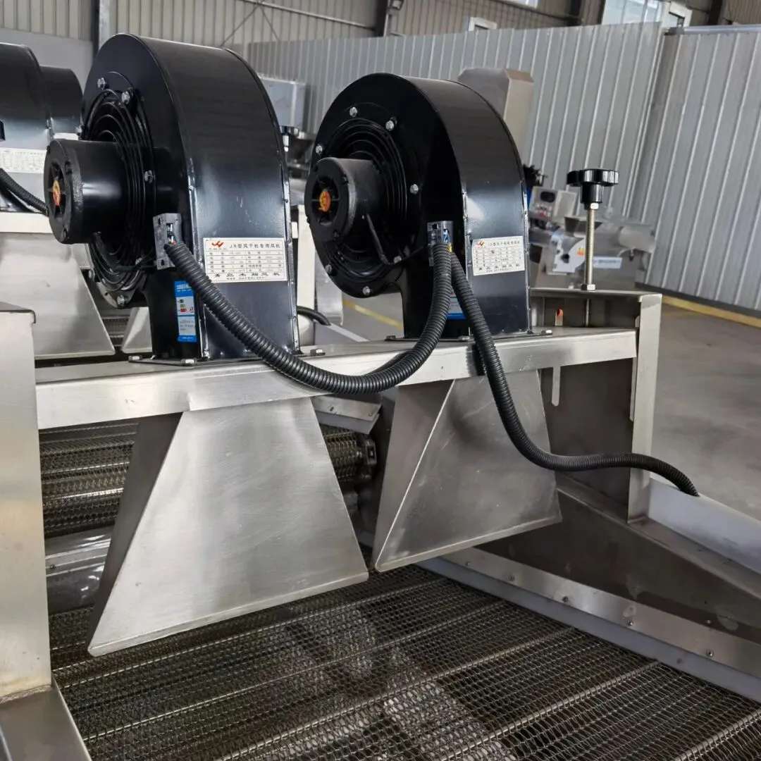 风干机除水后可直接装箱,可以实现连续作业,只需将杀菌后的产品放入输送网带,经风干机产生的气流经喷嘴喷射而出,吹干风温为常温,有效保护物料本身的色泽和品质,从而达到包装除水、除油渍、水垢等效果。