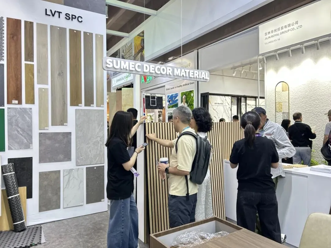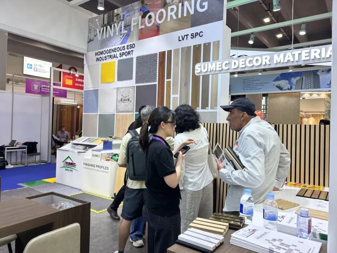 苏美达技贸在B区13.2I31-36、13.2J13-18展位聚焦多品类建材产品,精准满足全球采购需求。PU石板、SPC石晶墙板等新材料以“环保+耐磨”为核心优势,兼具装饰美学与实用性能,吸引众多客商驻足,团队细致讲解生产工艺与应用场景,不少客商现场表达采购意向并亲手体验产品质感。