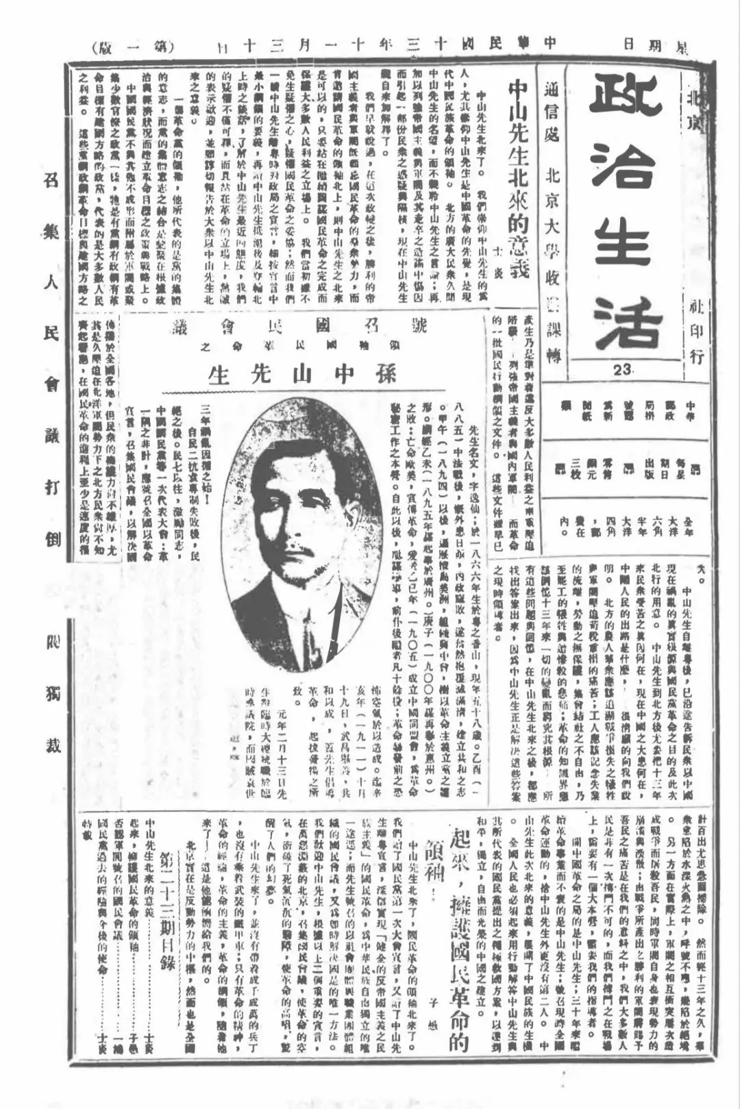 图为1924年11月30日,中共北方区委机关刊物《政治生活》发表文章,欢迎孙中山北上。