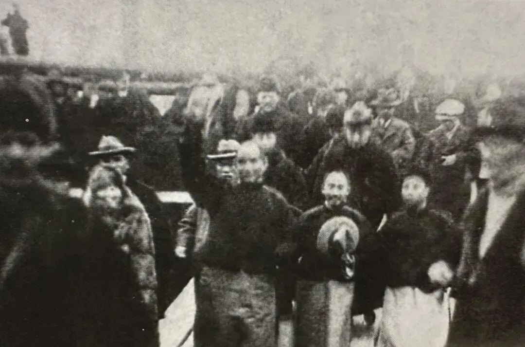 1924年12月4日,孙中山一行抵达天津利昌码头,受到天津工商学各界及市民团体2万余人的热烈欢迎。图为1924年12月4日,孙中山在利昌码头下船时向欢迎者招手致意。