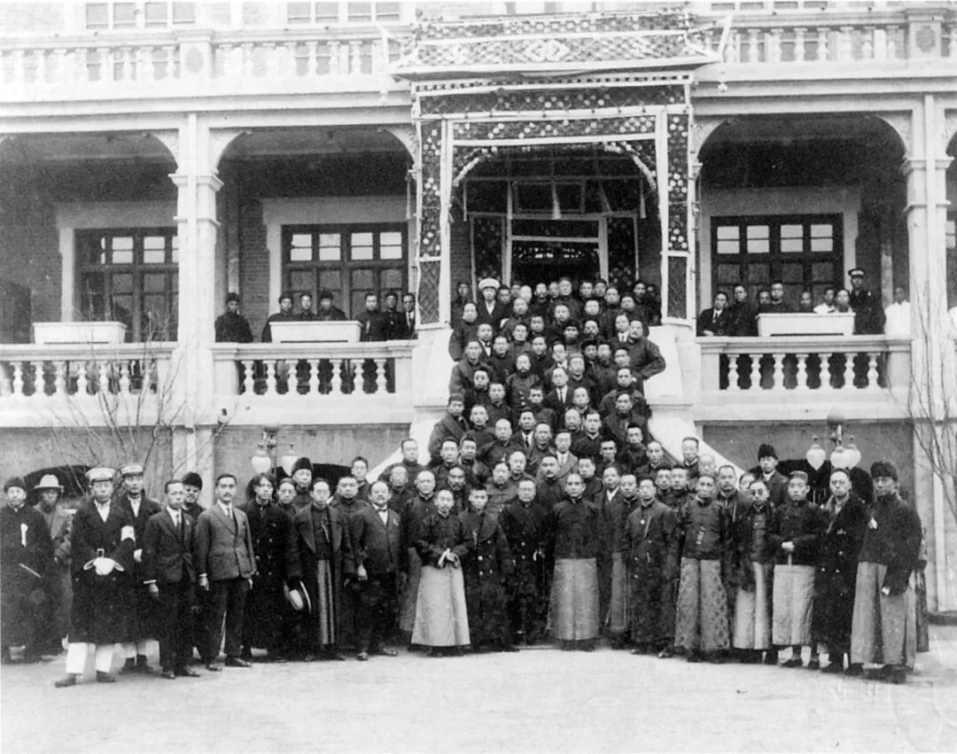 孙中山、宋庆龄一行下船后,乘坐马车至张园行馆下榻。随后,孙中山在张园平远楼前与各界欢迎代表合影留念。图为孙中山在张园与各界代表合影。