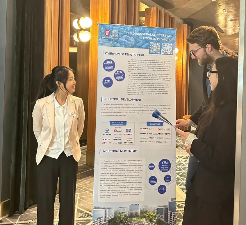 活动现场,“先丰企航”德国服务站围绕园区发展布局、产业特色、创新生态及营商服务等内容进行全面推介。重点展示丰台园区位优势、产业集聚基础与开放发展环境,系统介绍轨道交通、航空航天核心产业能级,以及智能制造、数字经济、医药健康等多元产业协同发展格局。