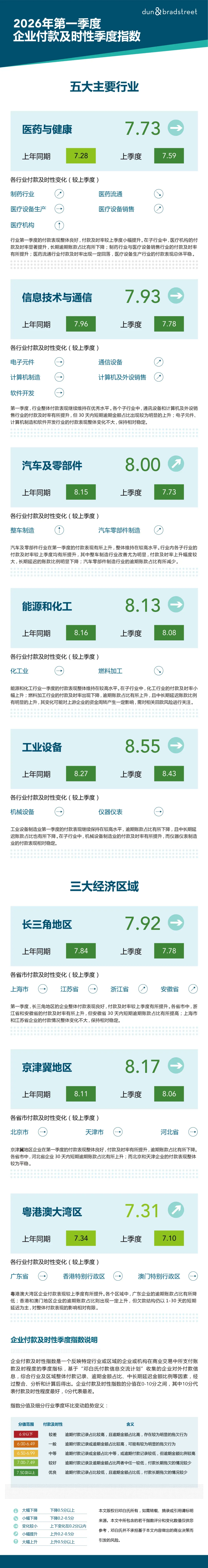 邓白氏发布了2026年第一季度我国主要行业和经济区域“企业付款及时性季度指数”数据。该指数通过对企业付款信息进行数据分析,按照行业和经济区域,对企业商业行为中的付款及时性进行衡量,涵盖医药与健康、信息技术与通信、汽车及零部件、能源与化工、工业设备五大行业,以及长三角、京津冀、粤港澳大湾区三大经济区域。